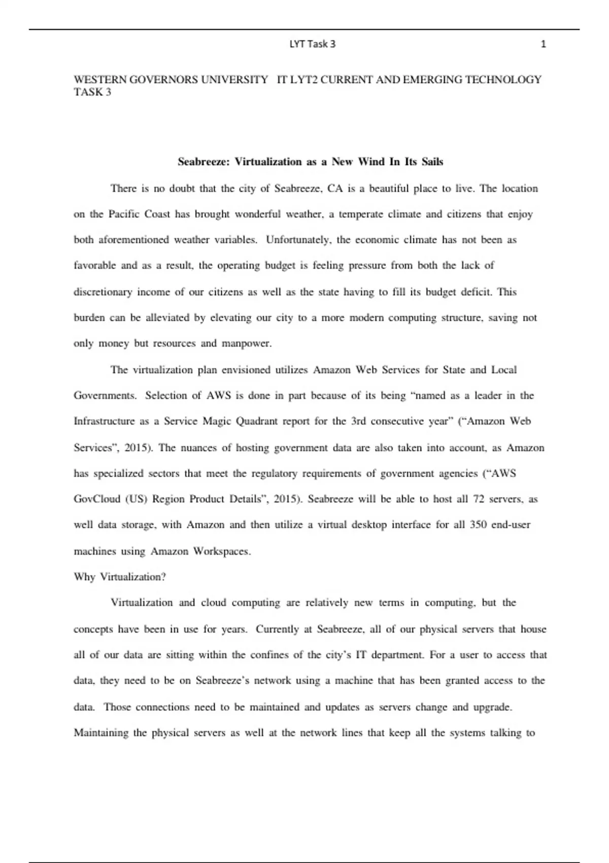 Seabreeze: Virtualization as a New Wind In Its Sails There is no doubt that the city of Seabreeze, CA is a beautiful place to live. The location on the Pacific Coast has brought wonderful weather, a temperate climate and citizens that enjoy both aforementioned weather variables. Unfortunately, the economic climate has not been as favorable and as a result, the operating budget is feeling pressure from both the lack of discretionary income of our citizens as well as the state having to fill its budget deficit. This burden can be alleviated by elevating our city to a more modern computing structure, saving not only money but resources and manpower. The virtualization plan envisioned utilizes Amazon Web Services for State and Local Governments. Selection of AWS is done in part because of its being “named as a leader in the Infrastructure as a Service Magic Quadrant report for the 3rd consecutive year” (“Amazon Web Services”, 2015). The nuances of hosting government data are also taken into account, as Amazon has specialized sectors that meet the regulatory requirements of government agencies (“AWS GovCloud (US) Region Product Details”, 2015). Seabreeze will be able to host all 72 servers, as well data storage, with Amazon and then utilize a virtual desktop interface for all 350 end-user machines using Amazon Workspaces. Why Virtualization? Virtualization and cloud computing are relatively new terms in computing, but the concepts have been in use for years. Currently at Seabreeze, all of our physical servers that house all of our data are sitting within the confines of the city’s IT department. For a user to access that data, they need to be on Seabreeze’s network using a machine that has been granted access to the data. Those connections need to be maintained and updates as servers change and upgrade. Maintaining the physical servers as well at the network lines that keep all the systems talking to