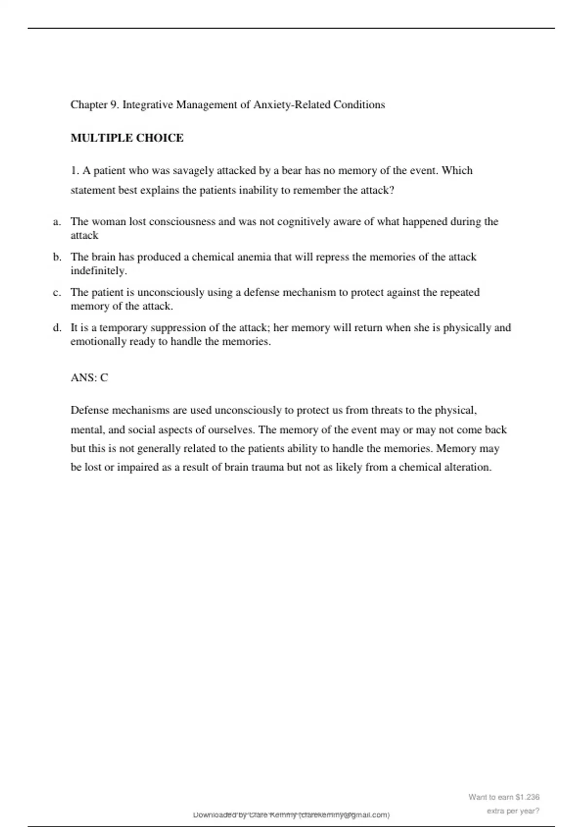 1. A patient who was savagely attacked by a bear has no memory of the event. Which