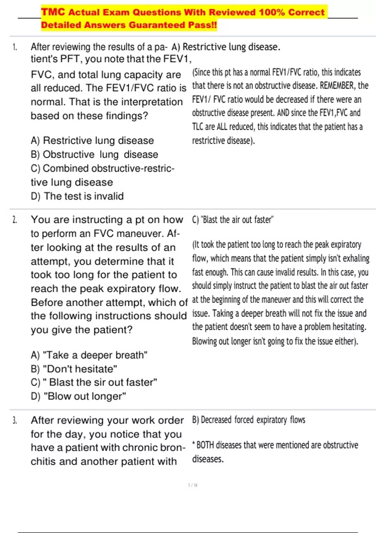 TMC Actual Exam Questions With Reviewed 100% Correct Detailed Answers Guaranteed Pass!! After reviewing the results of a pa- A) Restrictive lung disease. tient's PFT, you note that the FEV1, FVC, and total lung capacity are all reduced. The FEV1/FVC ratio is normal. That is the interpretation based on these findings? A) Restrictive lung disease B) Obstructive lung disease C) Combined obstructive-restric- tive lung disease D) The test is invalid (Since this pt has a normal FEV1/FVC ratio, this indicates that there is not an obstructive disease. REMEMBER, the FEV1/ FVC ratio would be decreased if there were an obstructive disease present. AND since the FEV1,FVC and TLC are ALL reduced, this indicates that the patient has a restrictive disease). 2. You are instructing a pt on how to perform an FVC maneuver. Af- ter looking at the results of an attempt, you determine that it took too long for the patient to reach the peak expiratory flow. Before another attempt, which of the following instructions should you give the patient? A) "Take a deeper breath" B) "Don't hesitate" C) " Blast the sir out faster" D) "Blow out longer" C) "Blast the air out faster" (It took the patient too long to reach the peak expiratory flow, which means that the patient simply isn't exhaling fast enough. This can cause invalid results. In this case, you should simply instruct the patient to blast the air out faster at the beginning of the maneuver and this will correct the issue. Taking a deeper breath will not fix the issue and the patient doesn't seem to have a problem hesitating. Blowing out longer isn't going to fix the issue either). 3. After reviewing your work order for the day, you notice that you have a patient with chronic bron- chitis and another patient with B) Decreased forced expiratory flows * BOTH diseases that were mentioned are obstructive diseases. 1 / 14 TMC Actual Exam Questions With Reviewed 100% Correct Detailed Answers Guaranteed Pass!! emphysema. Which of the follow- (We know that with obstructive diseases, the patient will ing PFT findings would you expect have decreases expiratory flow rates. Their FEV1% will be for these patients? A) Increased lung compliance B) Decreased forced expiratory flows C) Decreased total lung capacity D) Decreased diffusing capacity less than 70%. Air trapping is also common in obstructive diseases which will cause the TLC to be increased. A de- creased dittusing capacity tends to occur only in emphy- sema). 4. Simple spirometry can be used to D) Residual Volume measure any of the following EX- CEPT: A) Tidal Volume B) Vital Capacity C) Inspiratory reserve volume D) Residual Volume (A spirometer is a device that measures exhaled flow rates and volumes. It can be used to obtain measurements such as tidal volume, vital capacity, and FEV1. To get this one right, you have to know what Residual Volume is. It is the amount of air that is left in the lungs after a full exhalation. The residual volume cannot be exhaled. And because that is the case, it cannot be measured by simple spirometry). (Tidal volume, vital capacity, and IRV all can be measured with a spirometer. You would need a Plethysmography, aka a body box, in order to measure the residual volume). 5. You are assessing a patient with chronic asthma. She has a SVC of 3,500mL and a FVC of 2,500mL. Which of the following best ex- plains this difference? A) Increased compliance during a forced expiration B) Poor instruction by the previ- D) Air trapping during a forced expiration ( The first thing that should stand out is that the patient has asthma, which is an obstructive disease. And we know that air trapping is a commonality in obstructive diseases. If a patient has a significant ditterence between their slow vital capacity and forced vital capacity, this also indicates that air is trapped in the lungs when the patient exhales forcefully). 2 / 14 ous respiratory therapist C) Muscle fatigue during a forced expiration ( Because they airways are obstructed or constricted, as with bronchospasm in asthma, all of the air can be ex- D) Air trapping during a forced ex- pelled if the patient exhales slowly, it just takes longer. piration This explains why the values are slower with the FVC as compared to the SVC).