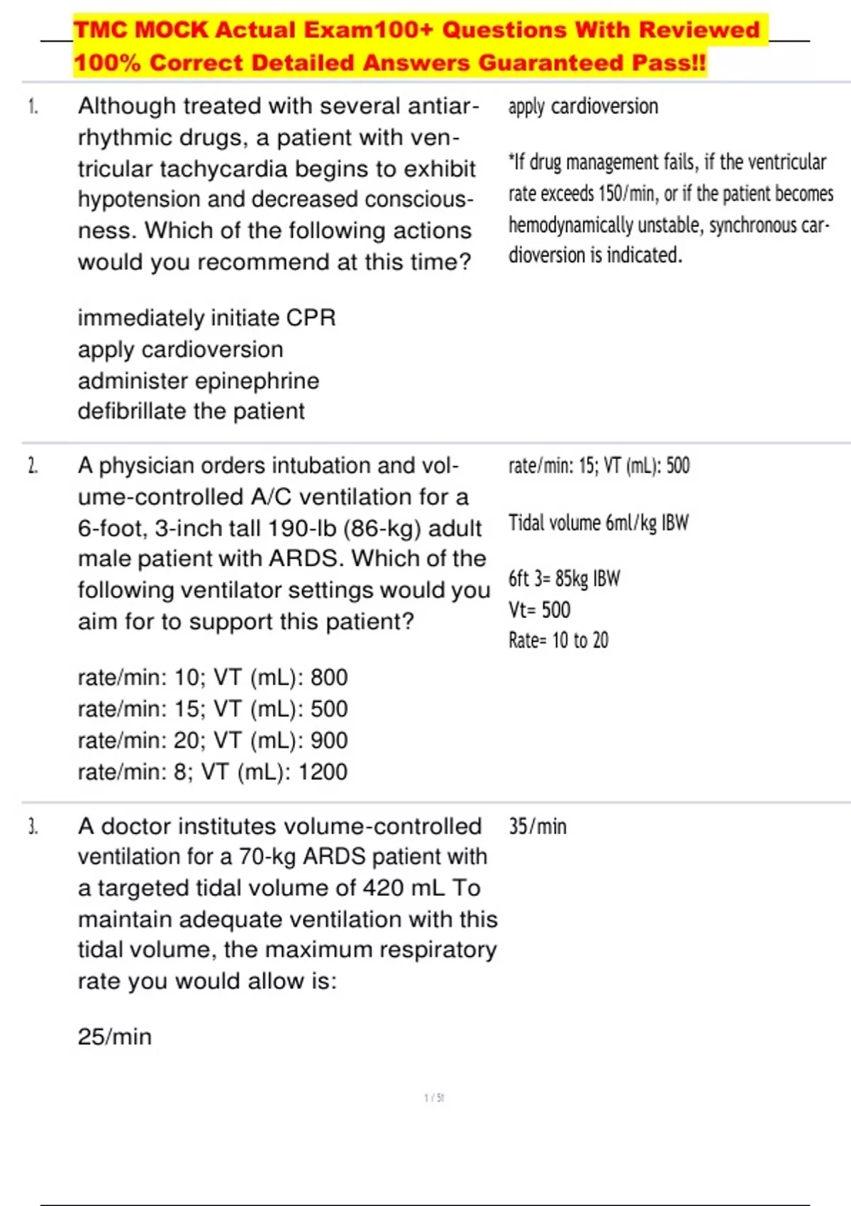 TMC MOCK Actual Exam100+ Questions With Reviewed 100% Correct Detailed Answers Guaranteed Pass!! 1. Although treated with several antiar- rhythmic drugs, a patient with ven- tricular tachycardia begins to exhibit hypotension and decreased conscious- ness. Which of the following actions would you recommend at this time? immediately initiate CPR apply cardioversion administer epinephrine defibrillate the patient apply cardioversion *If drug management fails, if the ventricular rate exceeds 150/min, or if the patient becomes hemodynamically unstable, synchronous car- dioversion is indicated. 2. A physician orders intubation and vol- ume-controlled A/C ventilation for a 6-foot, 3-inch tall 190-lb (86-kg) adult male patient with ARDS. Which of the following ventilator settings would you aim for to support this patient? rate/min: 10; VT (mL): 800 rate/min: 15; VT (mL): 500 rate/min: 20; VT (mL): 900 rate/min: 8; VT (mL): 1200 rate/min: 15; VT (mL): 500 Tidal volume 6ml/kg IBW 6ft 3= 85kg IBW Vt= 500 Rate= 10 to 20 3. A doctor institutes volume-controlled ventilation for a 70-kg ARDS patient with a targeted tidal volume of 420 mL To maintain adequate ventilation with this tidal volume, the maximum respiratory rate you would allow is: 25/min 35/min 1 / 51 TMC MOCK Actual Exam100+ Questions With Reviewed 100% Correct Detailed Answers Guaranteed Pass!! 35/min 20/min 30/min 4. Which of the following PaCO2 levels would be considered a positive result for at least 60 mm Hg brain death determination at the end of or 20+ from baseline CO2 an apnea test? -at least 50 mm Hg -at least 45 mm Hg -at least 60 mm Hg -at least 55 mm Hg 5. A COPD patient receiving volume-con- 2 and 3 only trolled A/C ventilation at a rate of 15 and a VT of 650 mL exhibits signs of air trap- * Adding an end-inspiratory pause would cause ping (auto-PEEP). Which of the following more airtrapping alternatives would you recommend to help overcome this problem? 1. add an end-inspiratory pause 2. switch to SIMV and decrease the rate 3. increase the inspiratory flow 2 and 3 only 1, 2, and 3 1 and 3 only 1 and 2 only