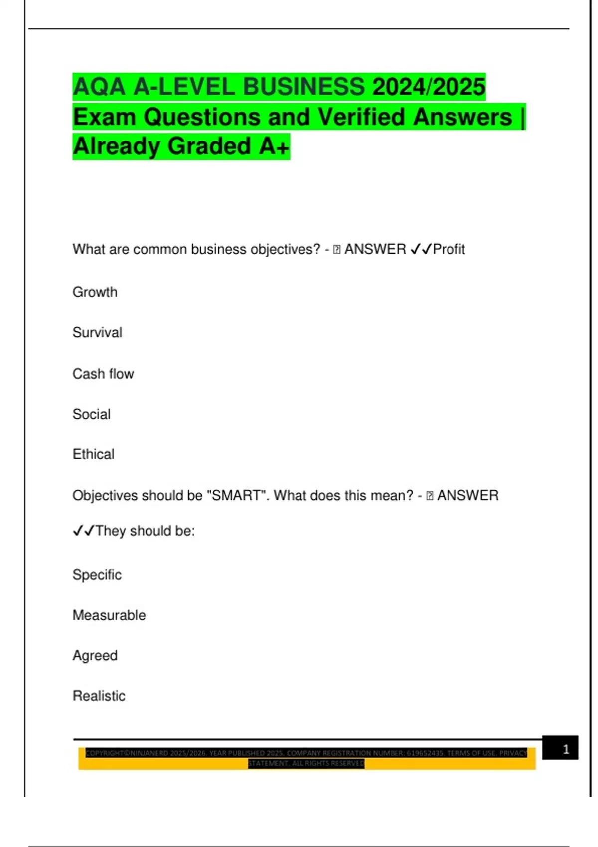 AQA A-LEVEL BUSINESS 2024/2025 Exam Questions and Verified Answers | Already Graded A+ What are common business objectives? -