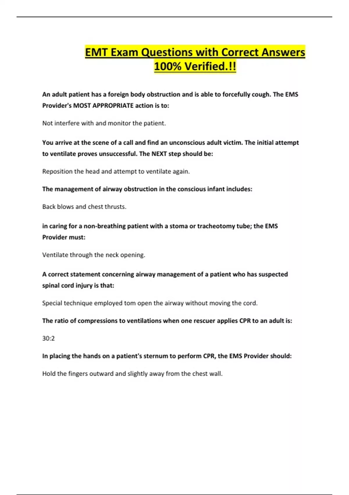 EMT Exam Questions with Correct Answers 100% Verified