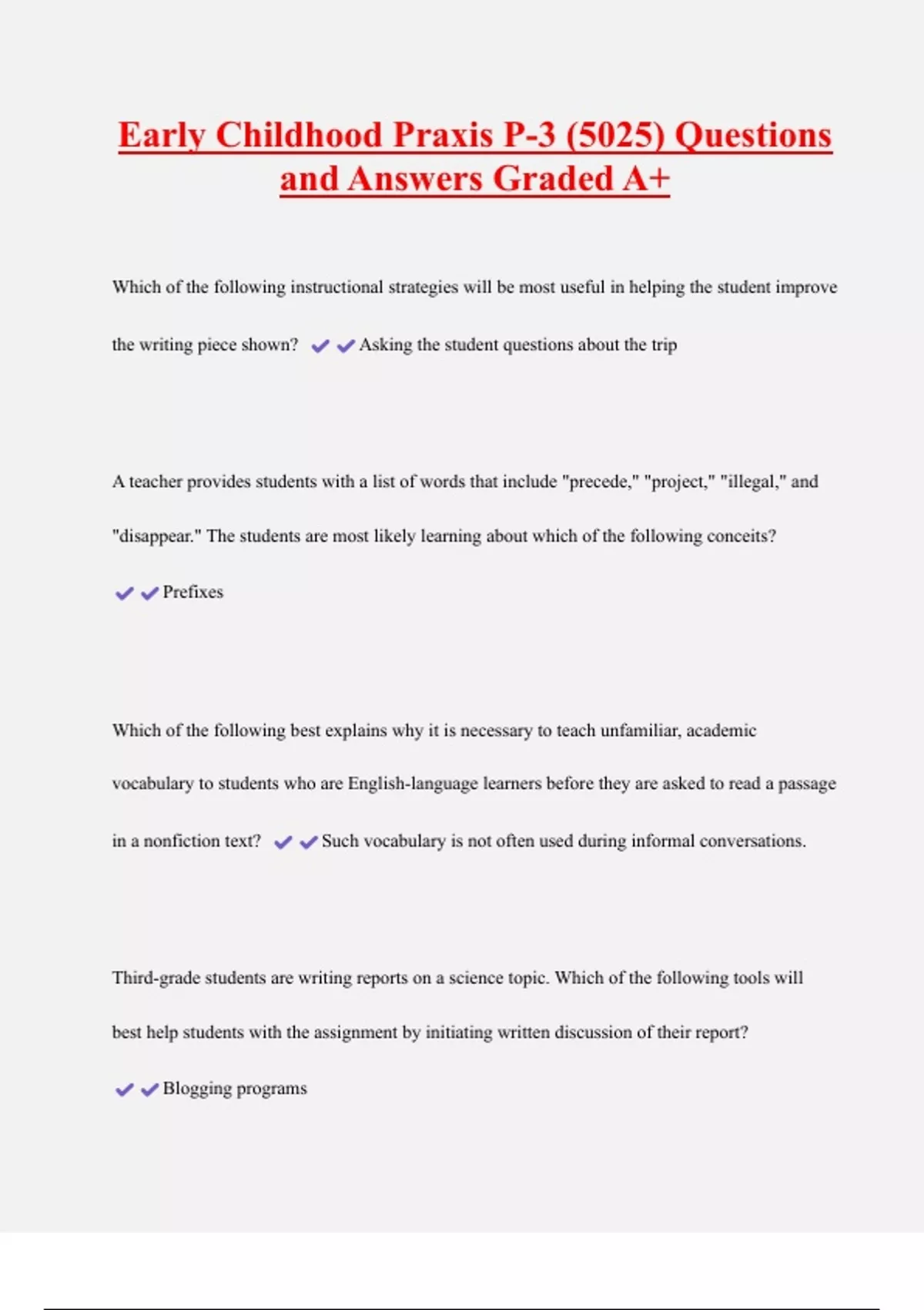 Early Childhood Praxis P-3 (5025) Questions and Answers Graded A+ Which of the following instructional strategies will be most useful in helping the student improve the writing piece shown? Asking the student questions about the trip A teacher provides students with a list of words that include "precede," "project," "illegal," and "disappear." The students are most likely learning about which of the following conceits? Prefixes