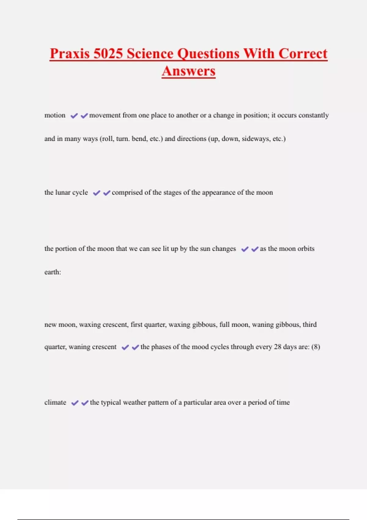 Praxis 5025 Science Questions With Correct Answers motion movement from one place to another or a change in position; it occurs constantly and in many ways (roll, turn. bend, etc.) and directions (up, down, sideways, etc.) the lunar cycle comprised of the stages of the appearance of the moon the portion of the moon that we can see lit up by the sun changes as the moon orbits earth:
