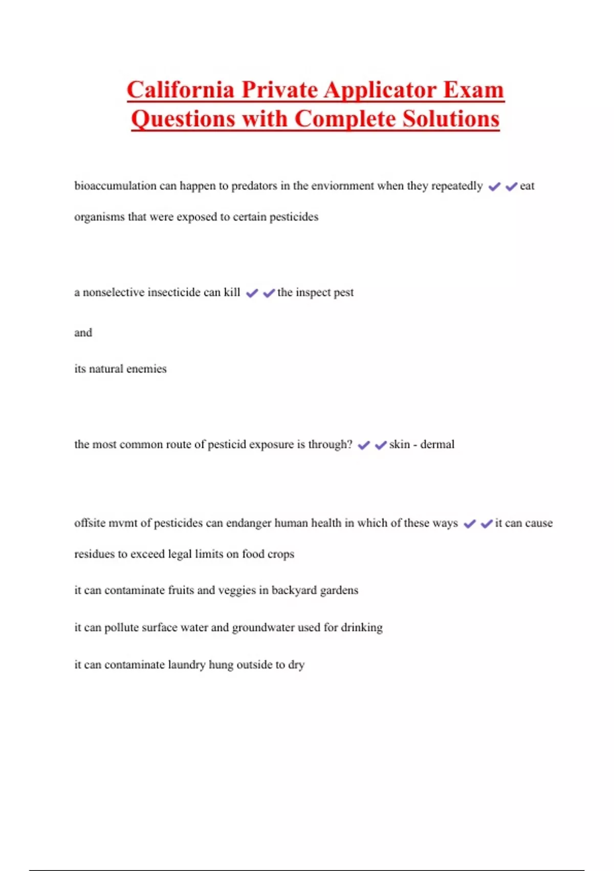 California Private Applicator Exam Questions with Complete Solutions bioaccumulation can happen to predators in the enviornment when they repeatedly eat organisms that were exposed to certain pesticides a nonselective insecticide can kill the inspect pest and its natural enemies the most common route of pesticid exposure is through? skin - dermal