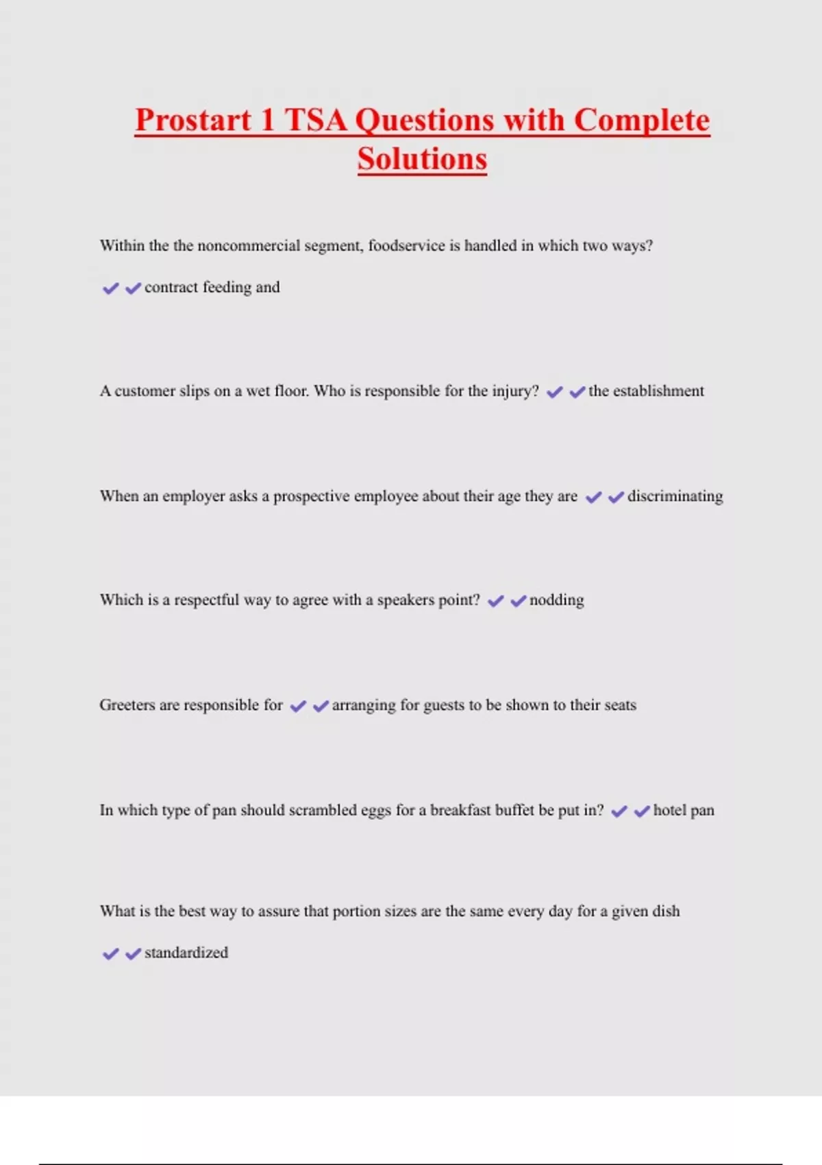 Prostart 1 TSA Questions with Complete Solutions Within the the noncommercial segment, foodservice is handled in which two ways? contract feeding and A customer slips on a wet floor. Who is responsible for the injury? the establishment When an employer asks a prospective employee about their age they are discriminating Which is a respectful way to agree with a speakers point? nodding