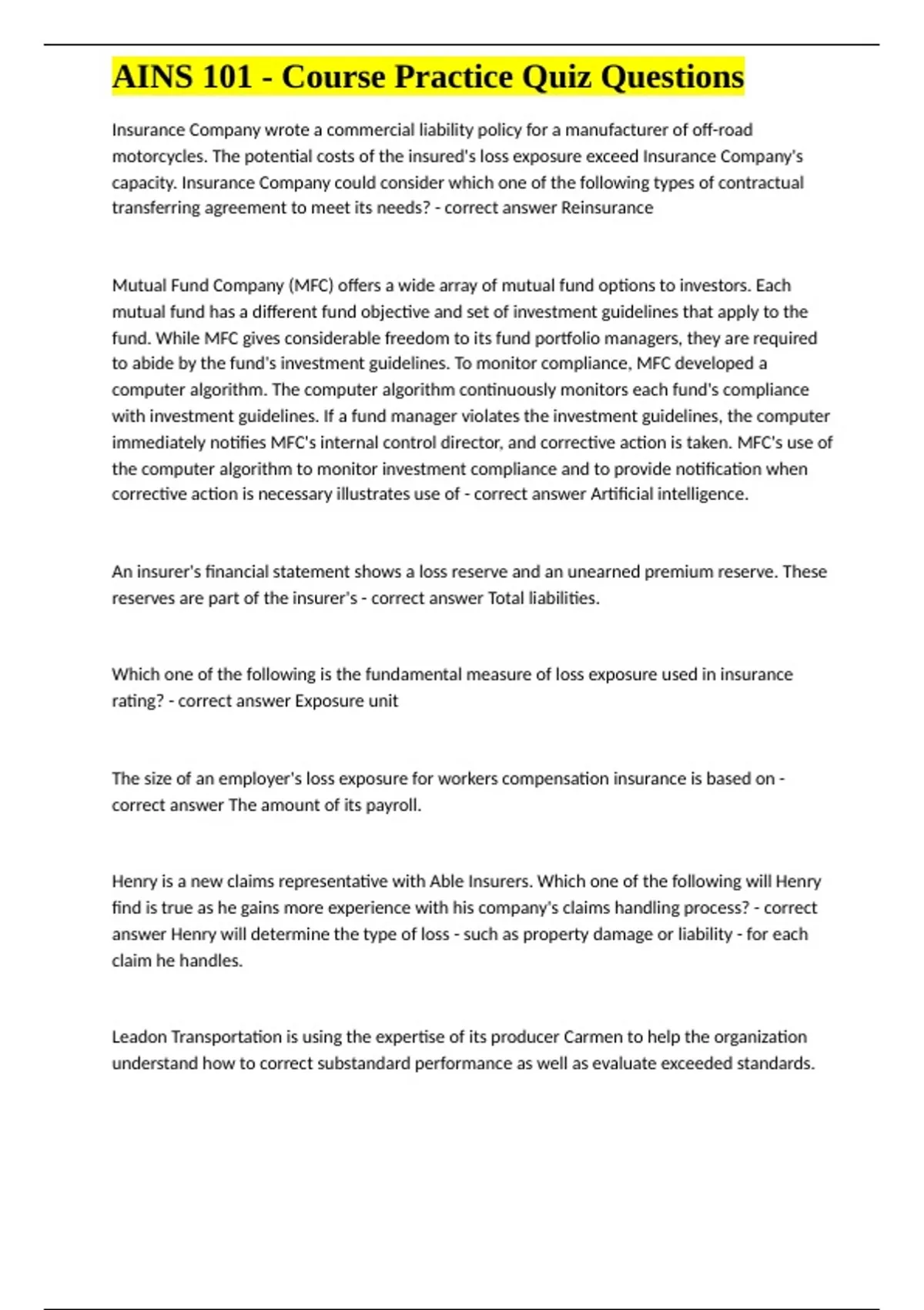 AINS 101 - Course Practice Exam Questions with revised correct solutions