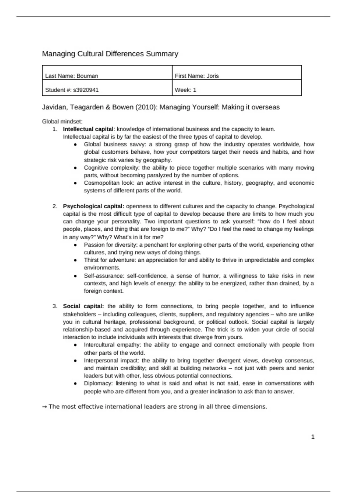 Summary of all mandatory literature for the course Managing Cultural Differences for the MSc International Business & Management (RUG).