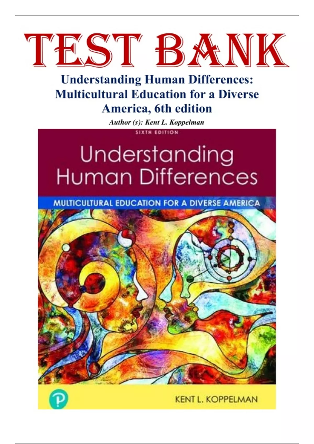 The complete test bank for Understanding Human Differences: Multicultural Education for a Diverse America (6th Edition) by Kent L. Koppelman (ISBN‑13: 978‑0‑13‑519673‑1, ISBN‑10: 0‑13‑519673‑6) provides full chapter‑by‑chapter assessment materials aligned with the textbook’s structure and learning objectives. According to the publisher’s official information, the book covers exactly fourteen chapters: Chapter 1: Understanding Ourselves and Others: Clarifying Values and Language, Chapter 2: Understanding Prejudice and Its Causes, Chapter 3: Communication, Conflict, and Conflict Resolution, Chapter 4: Immigration and Oppression: The Assault on Cultural and Language Diversity, Chapter 5: Race and Oppression: The Experiences of People of Color, Chapter 6: Religion and Oppression: The Struggle for Religious Freedom, Chapter 7: Rejecting Oppressive Relationships: The Logic of Cultural Pluralism for a Diverse Society, Chapter 8: Racism: Confronting a Legacy of White Domination in America, Chapter 9: Classism: Misperceptions and Myths About Income, Wealth, and Poverty, Chapter 10: Sexism: Where the Personal Becomes Political, Chapter 11: Heterosexism: Challenging the Heterosexism Assumption, Chapter 12: Ableism: Disability Does Not Mean Inability, Chapter 13: Pluralism in Schools: The Promise of Multicultural Education, and Chapter 14: Pluralism in Society: Creating Unity in a Diverse America.