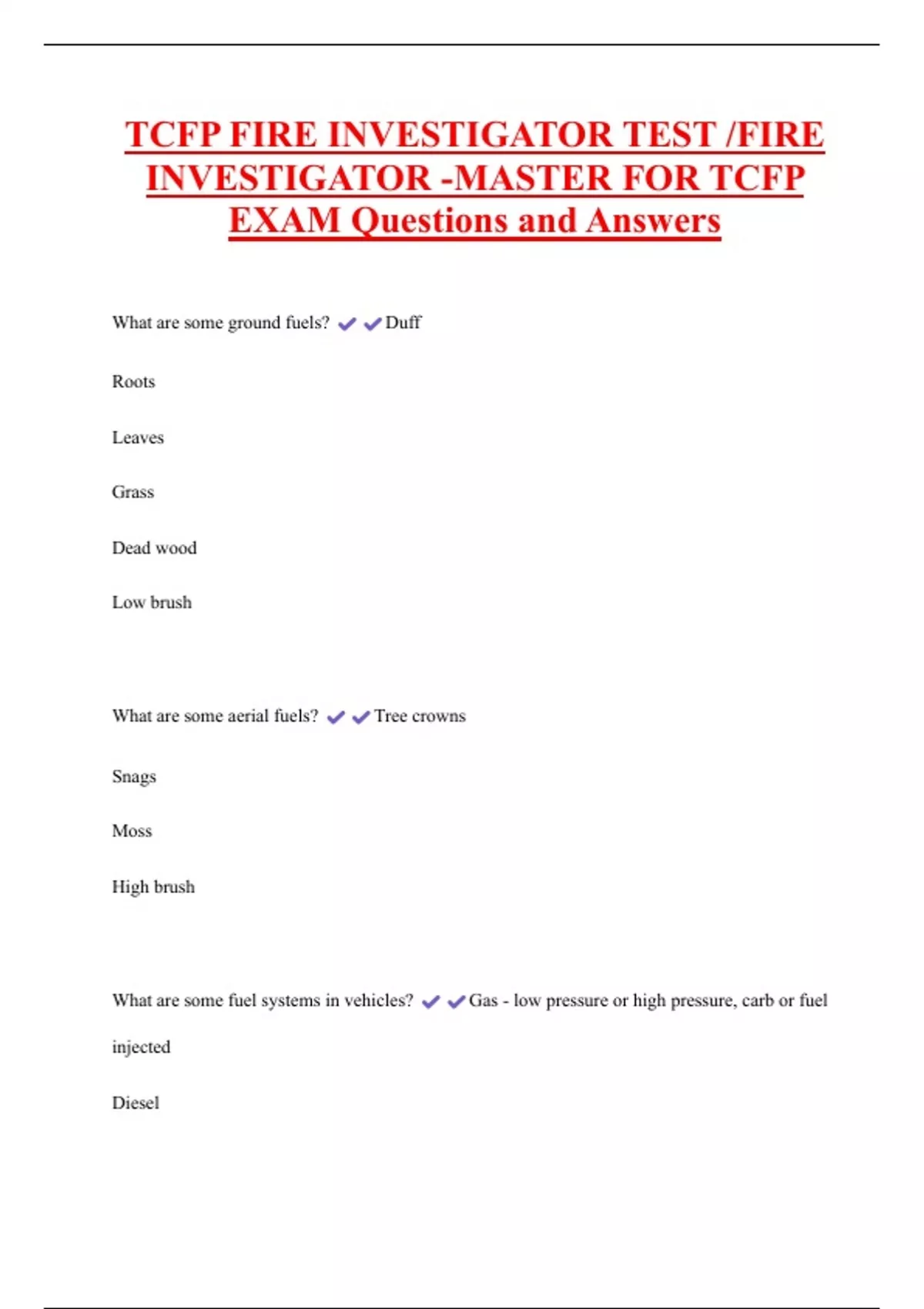 TCFP FIRE INVESTIGATOR TEST /FIRE INVESTIGATOR -MASTER FOR TCFP EXAM Questions and Answers What are some ground fuels? Duff Roots Leaves Grass Dead wood Low brush