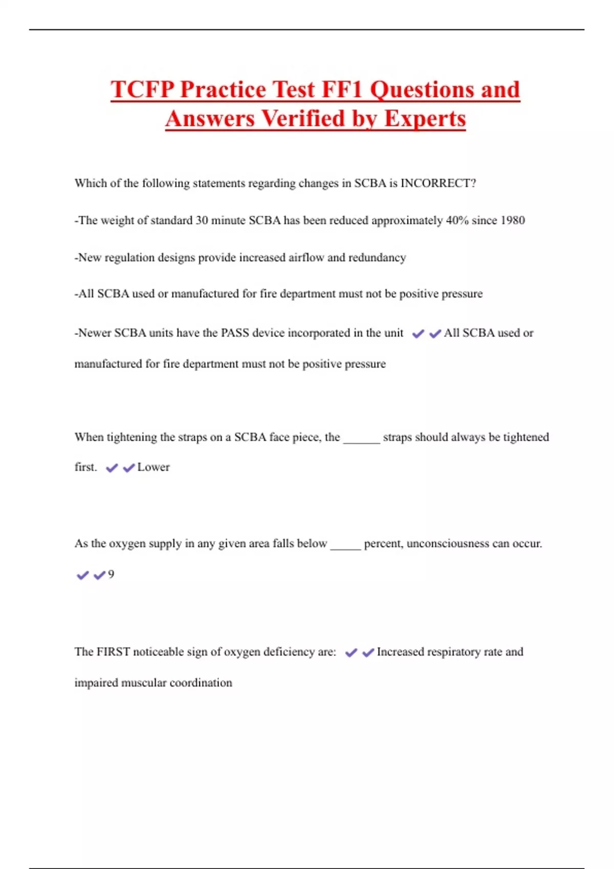 TCFP Practice Test FF1 Questions and Answers Verified by Experts Which of the following statements regarding changes in SCBA is INCORRECT? -The weight of standard 30 minute SCBA has been reduced approximately 40% since 1980 -New regulation designs provide increased airflow and redundancy -All SCBA used or manufactured for fire department must not be positive pressure -Newer SCBA units have the PASS device incorporated in the unit All SCBA used or manufactured for fire department must not be positive pressure