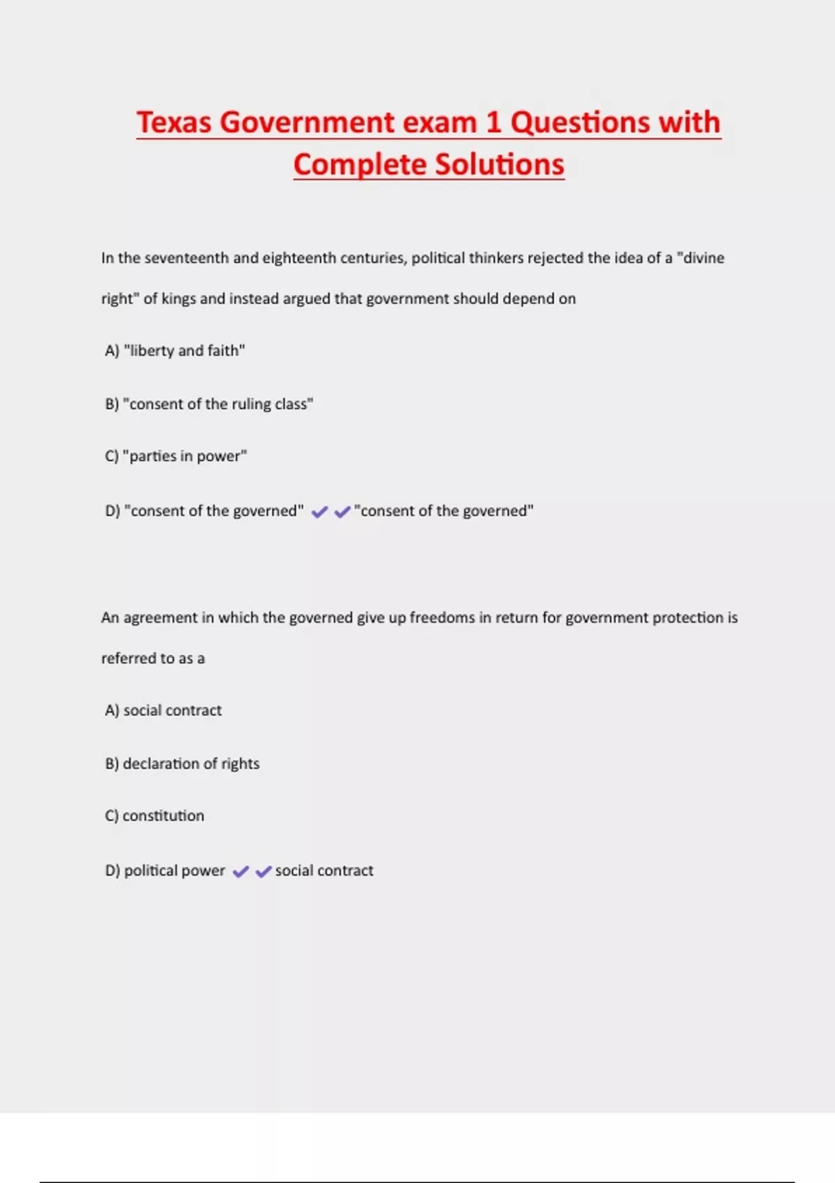 Texas Government exam 1 Questions with Complete Solutions In the seventeenth and eighteenth centuries, political thinkers rejected the idea of a "divine right" of kings and instead argued that government should depend on A) "liberty and faith" B) "consent of the ruling class" C) "parties in power" D) "consent of the governed" "consent of the governed"