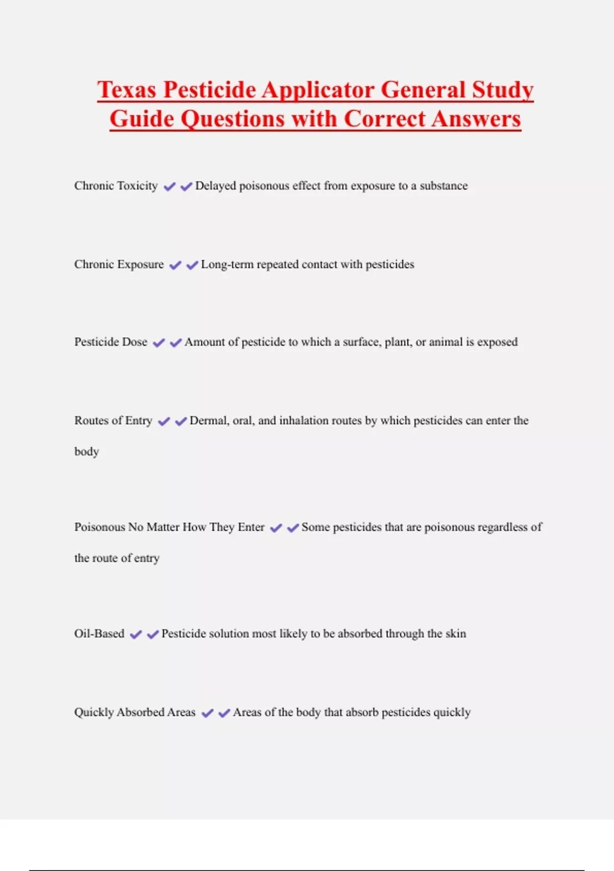 Texas Pesticide Applicator General Study Guide Questions with Correct Answers Chronic Toxicity Delayed poisonous effect from exposure to a substance Chronic Exposure Long-term repeated contact with pesticides Pesticide Dose Amount of pesticide to which a surface, plant, or animal is exposed