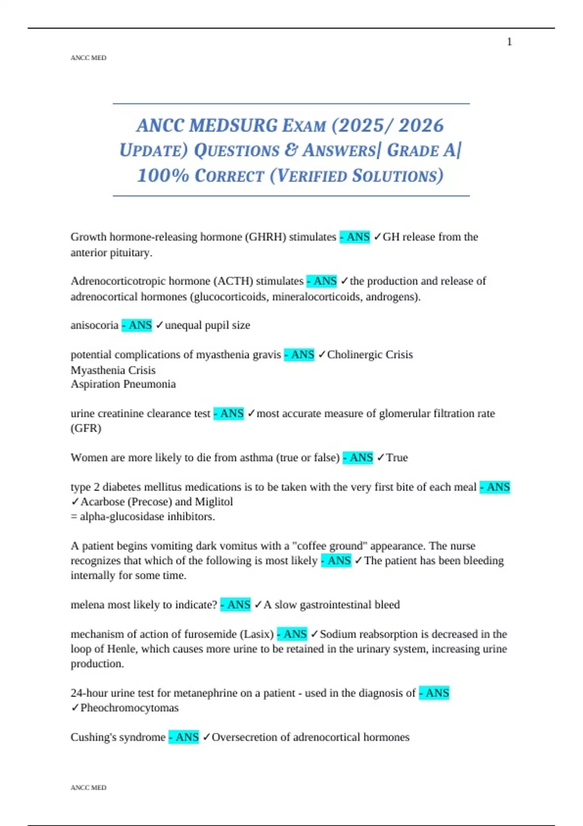 This document provides the newest 2025/2026 update of the ANCC Medical-Surgical Nursing Certification Exam, featuring verified questions and 100% correct solutions. It covers essential topics such as patient care management, pathophysiology, pharmacology, clinical decision-making, and professional nursing practice. Designed for nurses preparing for ANCC Med-Surg certification, this Grade A study guide ensures comprehensive preparation and guaranteed accuracy.
