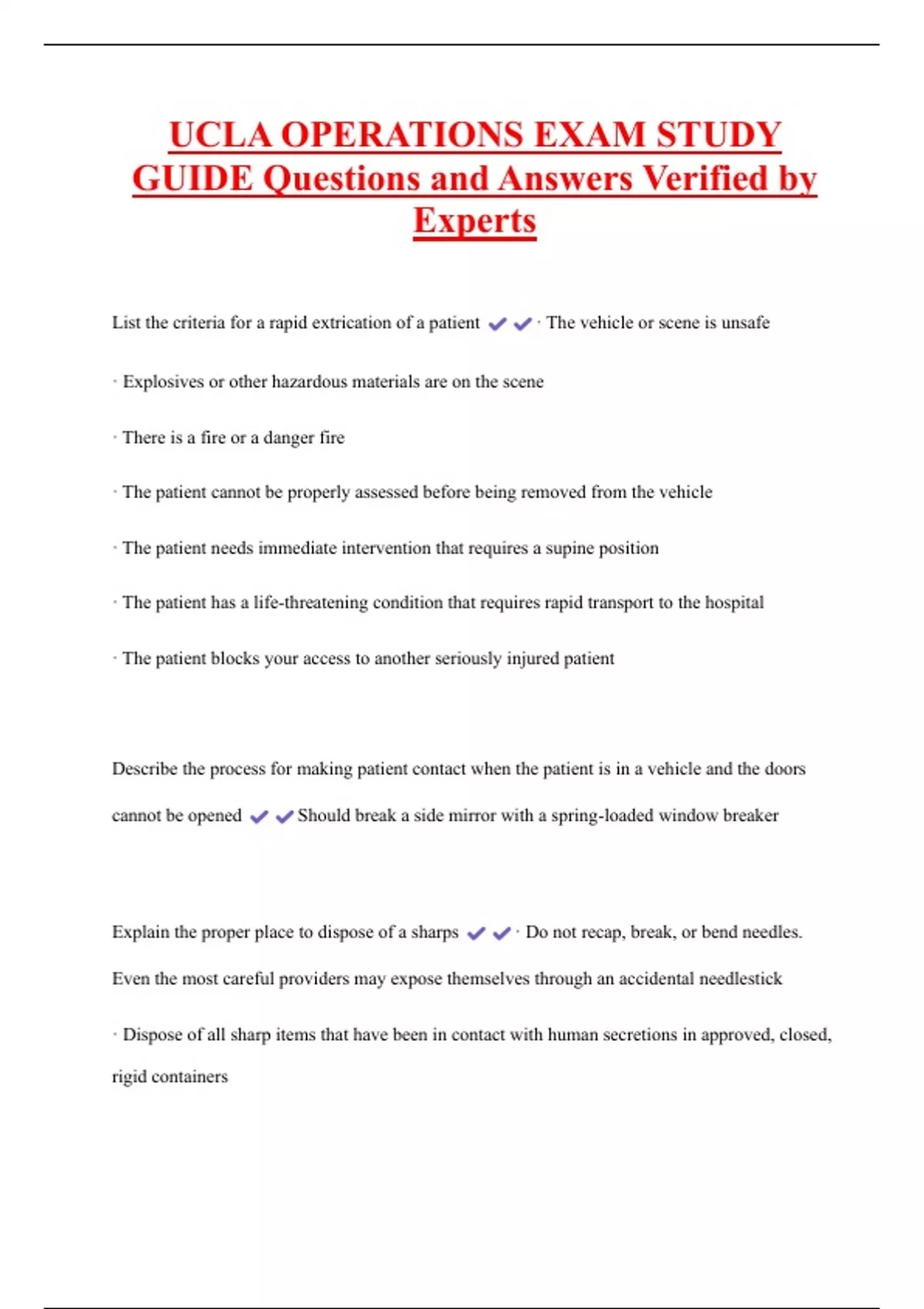 UCLA OPERATIONS EXAM STUDY GUIDE Questions and Answers Verified by Experts List the criteria for a rapid extrication of a patient · The vehicle or scene is unsafe · Explosives or other hazardous materials are on the scene · There is a fire or a danger fire · The patient cannot be properly assessed before being removed from the vehicle · The patient needs immediate intervention that requires a supine position · The patient has a life-threatening condition that requires rapid transport to the hospital · The patient blocks your access to another seriously injured patient