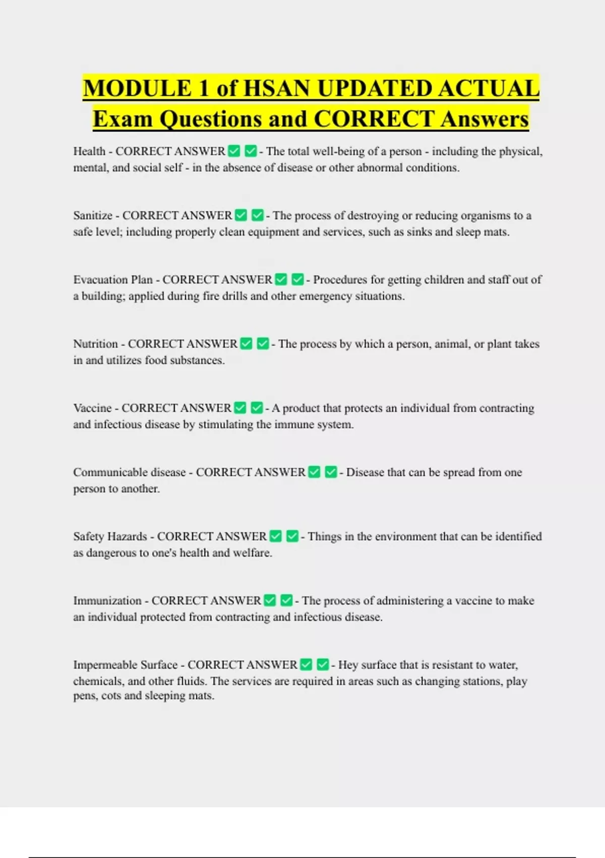 MODULE 1 of HSAN UPDATED ACTUAL Exam Questions and CORRECT Answers Health - CORRECT ANSWER - The total well-being of a person - including the physical, mental, and social self - in the absence of disease or other abnormal conditions. Sanitize - CORRECT ANSWER - The process of destroying or reducing organisms to a safe level; including properly clean equipment and services, such as sinks and sleep mats. Evacuation Plan - CORRECT ANSWER - Procedures for getting children and staff out of a building; applied during fire drills and other emergency situations.