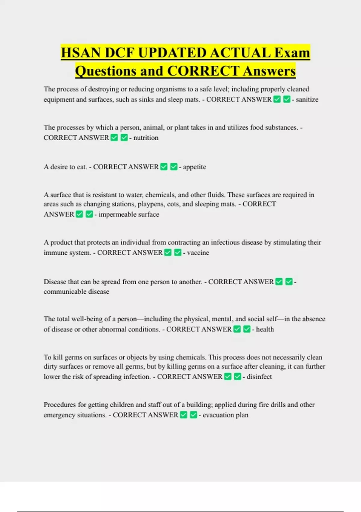 HSAN DCF UPDATED ACTUAL Exam Questions and CORRECT Answers The process of destroying or reducing organisms to a safe level; including properly cleaned equipment and surfaces, such as sinks and sleep mats. - CORRECT ANSWER - sanitize The processes by which a person, animal, or plant takes in and utilizes food substances. - CORRECT ANSWER - nutrition A desire to eat. - CORRECT ANSWER - appetite A surface that is resistant to water, chemicals, and other fluids. These surfaces are required in areas such as changing stations, playpens, cots, and sleeping mats. - CORRECT ANSWER - impermeable surfac