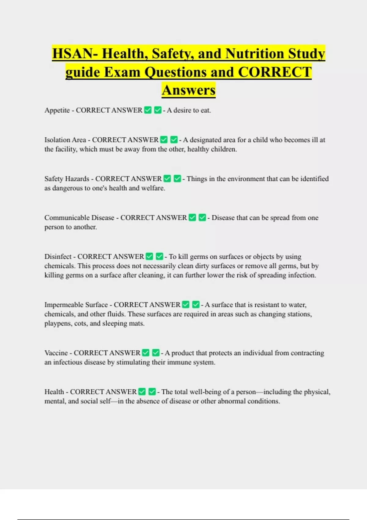 HSAN- Health, Safety, and Nutrition Study guide Exam Questions and CORRECT Answers Appetite - CORRECT ANSWER Isolation Area - CORRECT ANSWER - A desire to eat. - A designated area for a child who becomes ill at the facility, which must be away from the other, healthy children. Safety Hazards - CORRECT ANSWER as dangerous to one's health and welfare. - Things in the environment that can be identified Communicable Disease - CORRECT ANSWER person to another. Disinfect - CORRECT ANSWER - Disease that can be spread from o