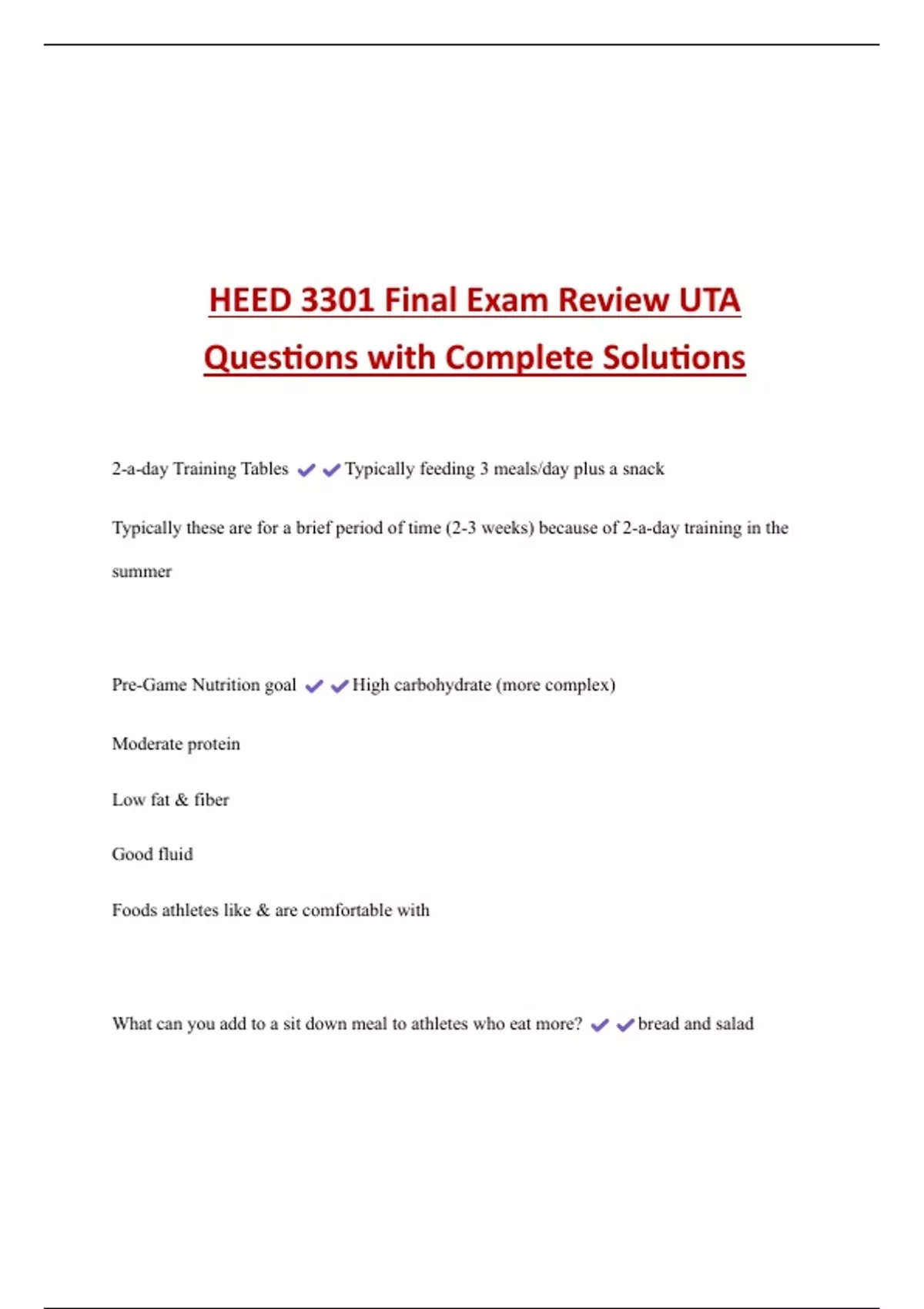 HEED 3301 Final Exam Review UTA Questions with Complete Solutions 2-a-day Training Tables Typically feeding 3 meals/day plus a snack Typically these are for a brief period of time (2-3 weeks) because of 2-a-day training in the summer Pre-Game Nutrition goal High carbohydrate (more complex) Moderate protein Low fat & fiber Good fluid Foods athletes like & are comfortable with