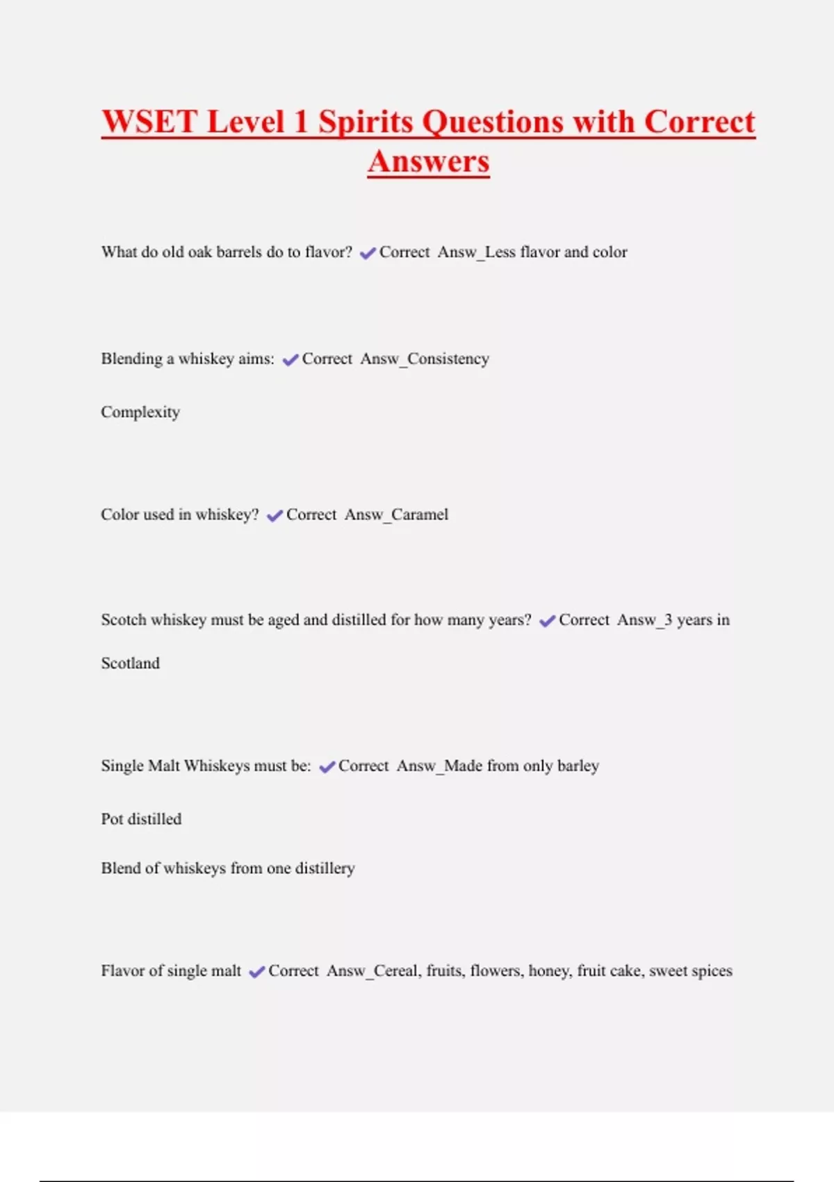 WSET Level 1 Spirits Questions with Correct Answers What do old oak barrels do to flavor? Correct Answ_Less flavor and color Blending a whiskey aims: Correct Answ_Consistency Complexity Color used in whiskey? Correct Answ_Caramel