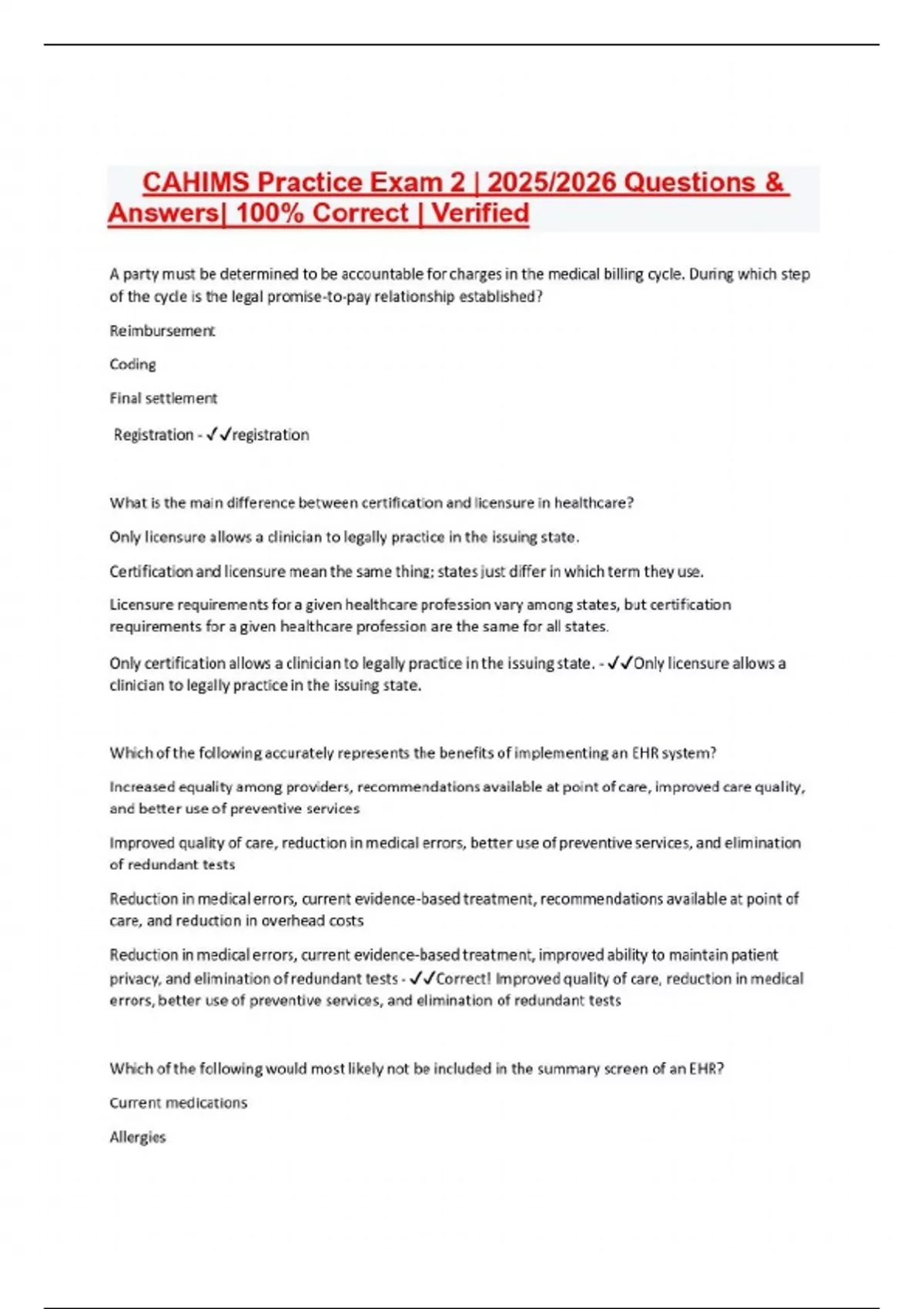 CAHIMS Practice Exam 2 | 2025/2026 Questions & Answers| 100% Correct | Verified A party must be determined to be accountable for charges in the medical billing cycle. During which step of the cycle is the legal promise-to-pay relationship established? Reimbursement Coding Final settlement Registration - registration What is the main difference between certification and licensure in healthcare? Only licensure allows a clinician to legally practice in the issuing state. Certification and licensure mean the same thing; states just differ in which term they use. Licensure requirements for a given healthcare profession vary among states, but certification requirements for a given healthcare profession are the same for all states. Only certification allows a clinician to legally practice in the issuing state. - Only licensure allows a clinician to legally practice in the issuing state. Which of the following accurately represents the benefits of implementing an EHR system? Increased equality among providers, recommendations available at point of care, improved care quality, and better use of preventive services Improved quality of care, reduction in medical errors, better use of preventive services, and elimination of redundant tests
