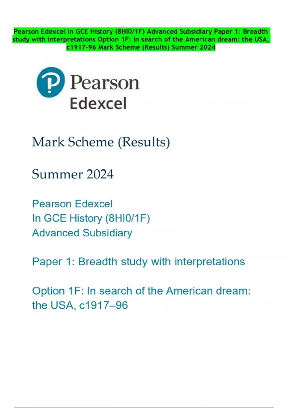 Pearson Edexcel In GCE History (8HI0/1F) Advanced Subsidiary Paper 1: Breadth study with interpretations Option 1F: In search of the American dream: the USA, c1917–96 Mark Scheme (Results) Summer 2024