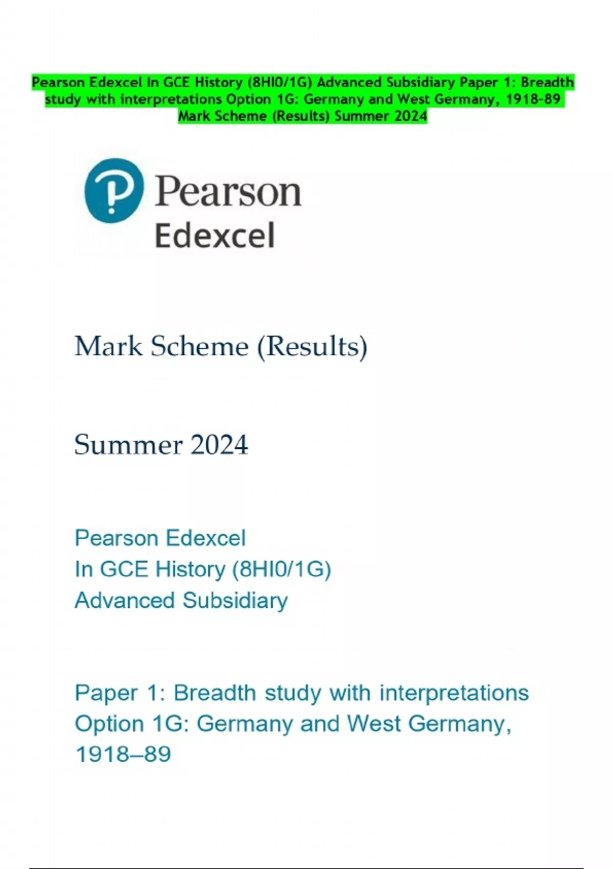 Pearson Edexcel In GCE History (8HI0/1G) Advanced Subsidiary Paper 1: Breadth study with interpretations Option 1G: Germany and West Germany, 1918–89 Mark Scheme (Results) Summer 2024