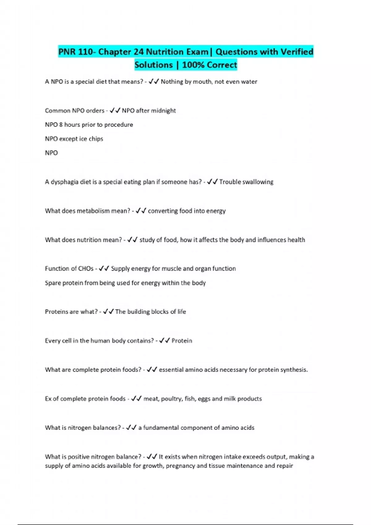 PNR 110- Chapter 24 Nutrition Exam| Questions with Verified Solutions | 100% Correct