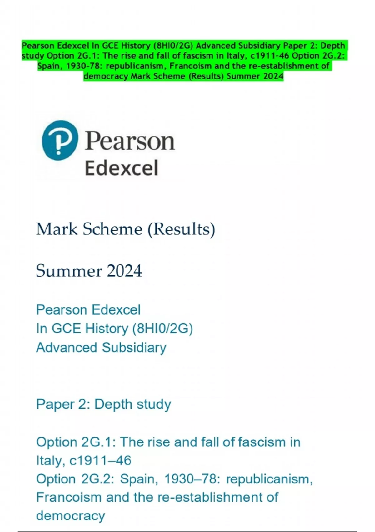 Pearson Edexcel In GCE History (8HI0/2G) Advanced Subsidiary Paper 2: Depth study Option 2G.1: The rise and fall of fascism in Italy, c1911–46 Option 2G.2: Spain, 1930–78: republicanism, Francoism and the re-establishment of democracy Mark Scheme (Results) Summer 2024