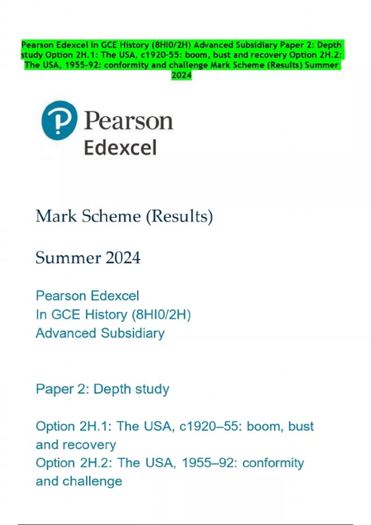 Pearson Edexcel In GCE History (8HI0/2H) Advanced Subsidiary Paper 2: Depth study Option 2H.1: The USA, c1920–55: boom, bust and recovery Option 2H.2: The USA, 1955–92: conformity and challenge Mark Scheme (Results) Summer 2024