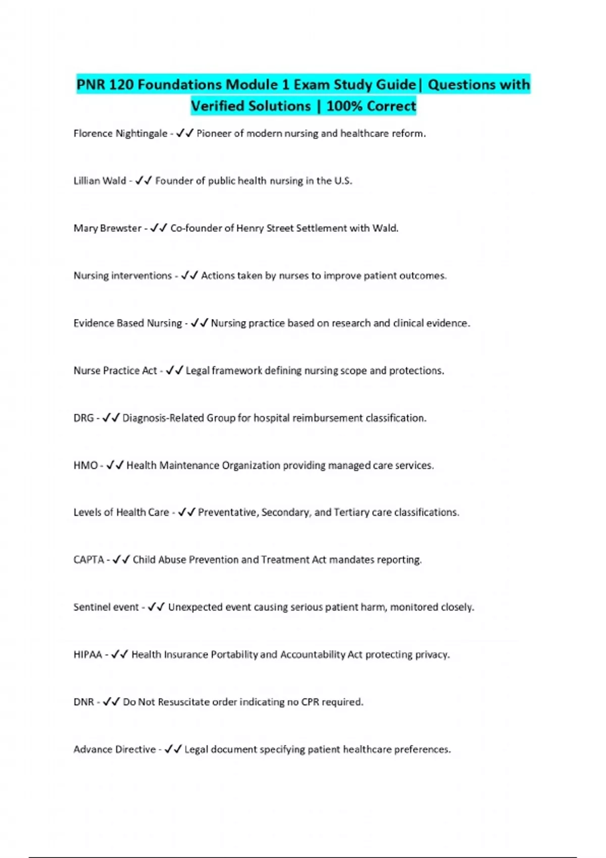 PNR 120 Foundations Module 1 Exam Study Guide| Questions with Verified Solutions | 100% Correct