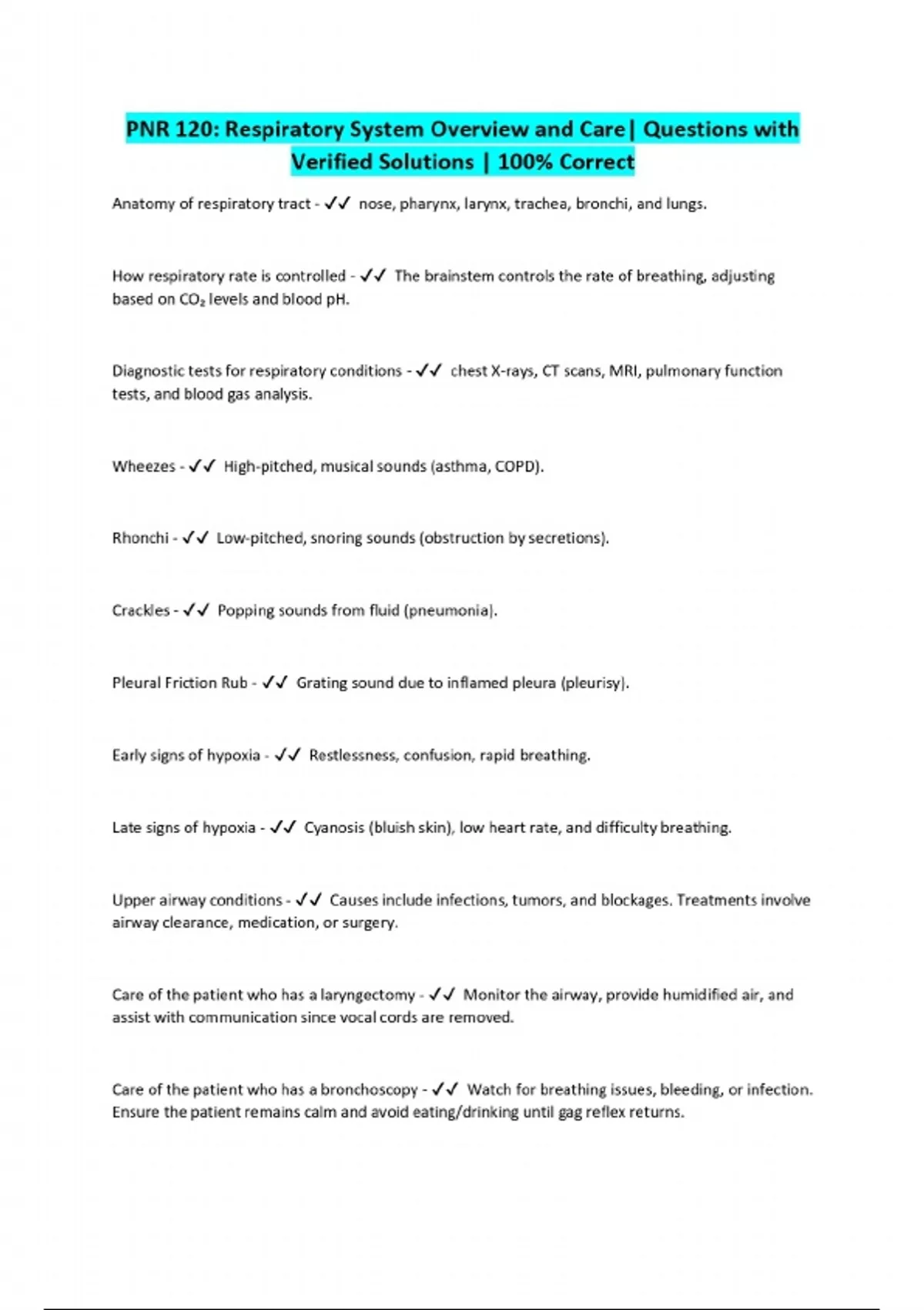 PNR 120: Respiratory System Overview and Care| Questions with Verified Solutions | 100% Correct