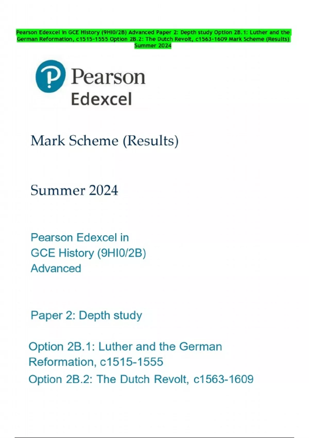 Pearson Edexcel in GCE History (9HI0/2B) Advanced Paper 2: Depth study Option 2B.1: Luther and the German Reformation, c Option 2B.2: The Dutch Revolt, c Mark Scheme (Results) Summer 2024