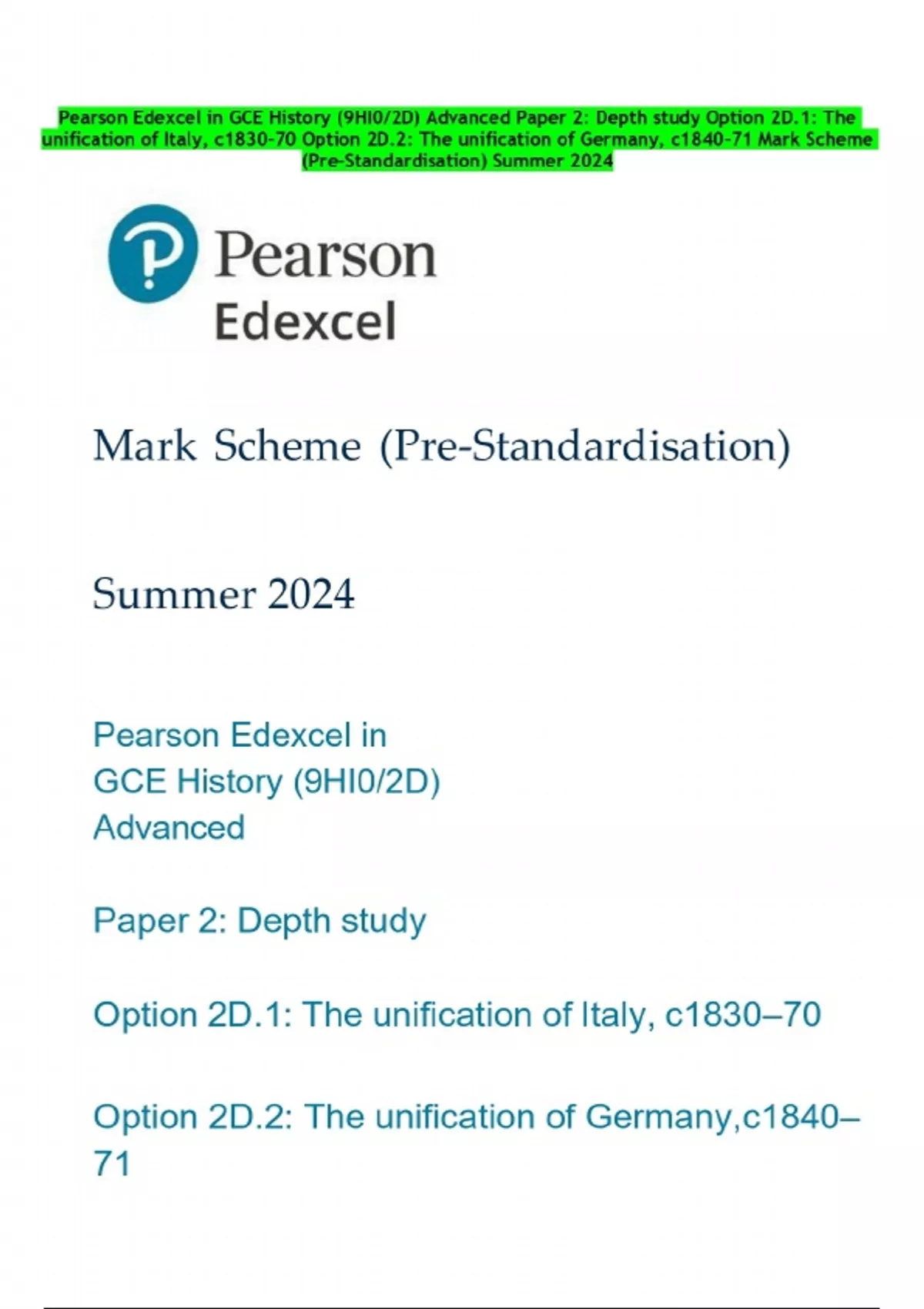 Pearson Edexcel in GCE History (9HI0/2D) Advanced Paper 2: Depth study Option 2D.1: The unification of Italy, c1830–70 Option 2D.2: The unification of Germany, c1840–71 Mark Scheme (Pre-Standardisation) Summer 2024