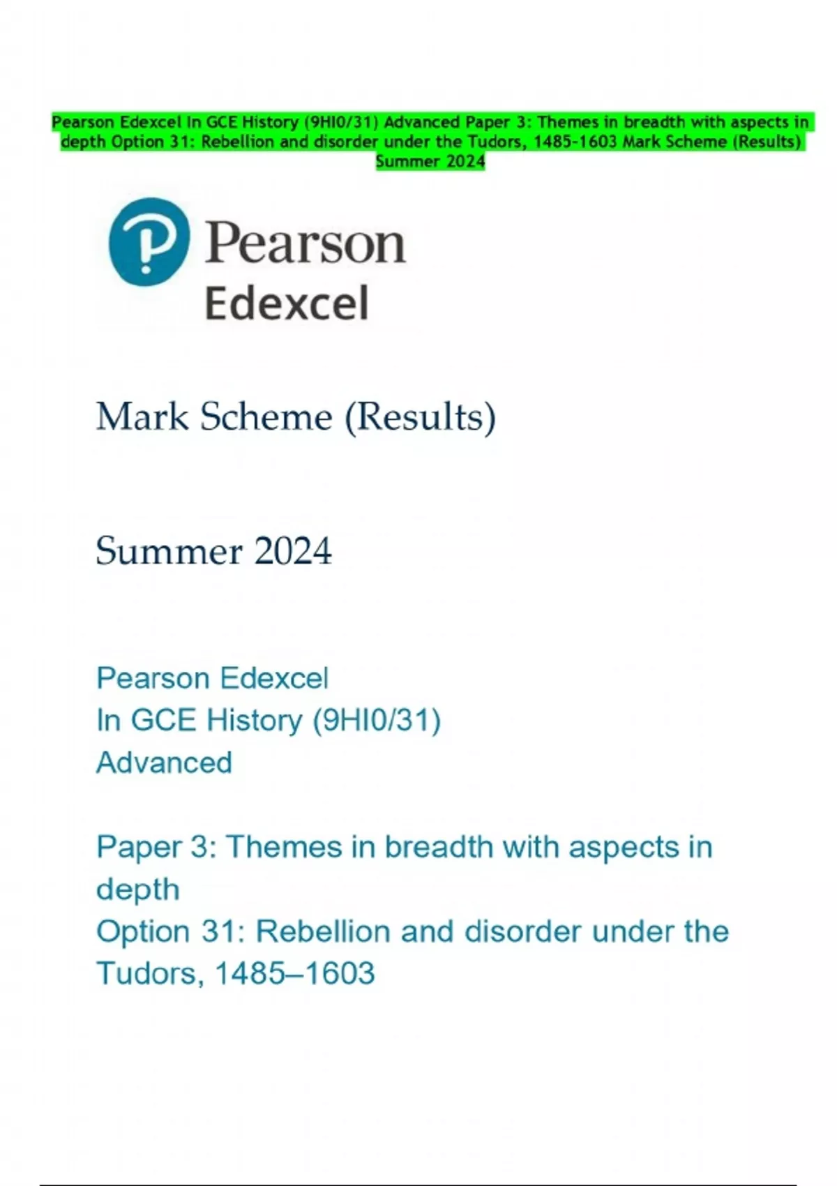 Pearson Edexcel In GCE History (9HI0/31) Advanced Paper 3: Themes in breadth with aspects in depth Option 31: Rebellion and disorder under the Tudors, 1485–1603 Mark Scheme (Results) Summer 2024
