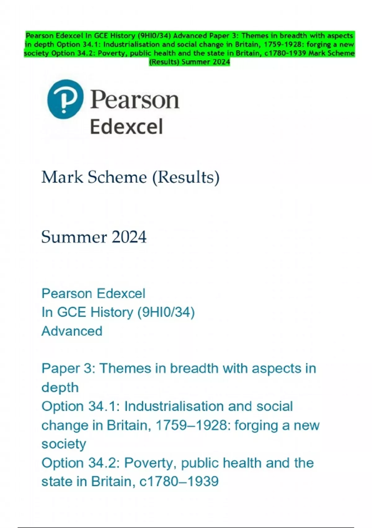 Pearson Edexcel In GCE History (9HI0/34) Advanced Paper 3: Themes in breadth with aspects in depth Option 34.1: Industrialisation and social change in Britain, 1759–1928: forging a new society Option 34.2: Poverty, public health and the state in Britain, c1780–1939 Mark Scheme (Results) Summer 2024