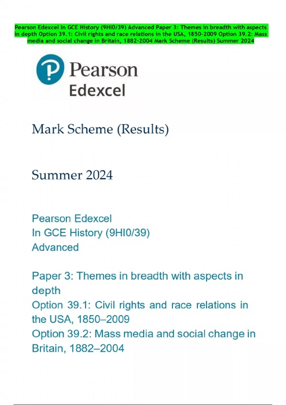 Pearson Edexcel In GCE History (9HI0/39) Advanced Paper 3: Themes in breadth with aspects in depth Option 39.1: Civil rights and race relations in the USA, 1850–2009 Option 39.2: Mass media and social change in Britain, 1882–2004 Mark Scheme (Results) Summer 2024