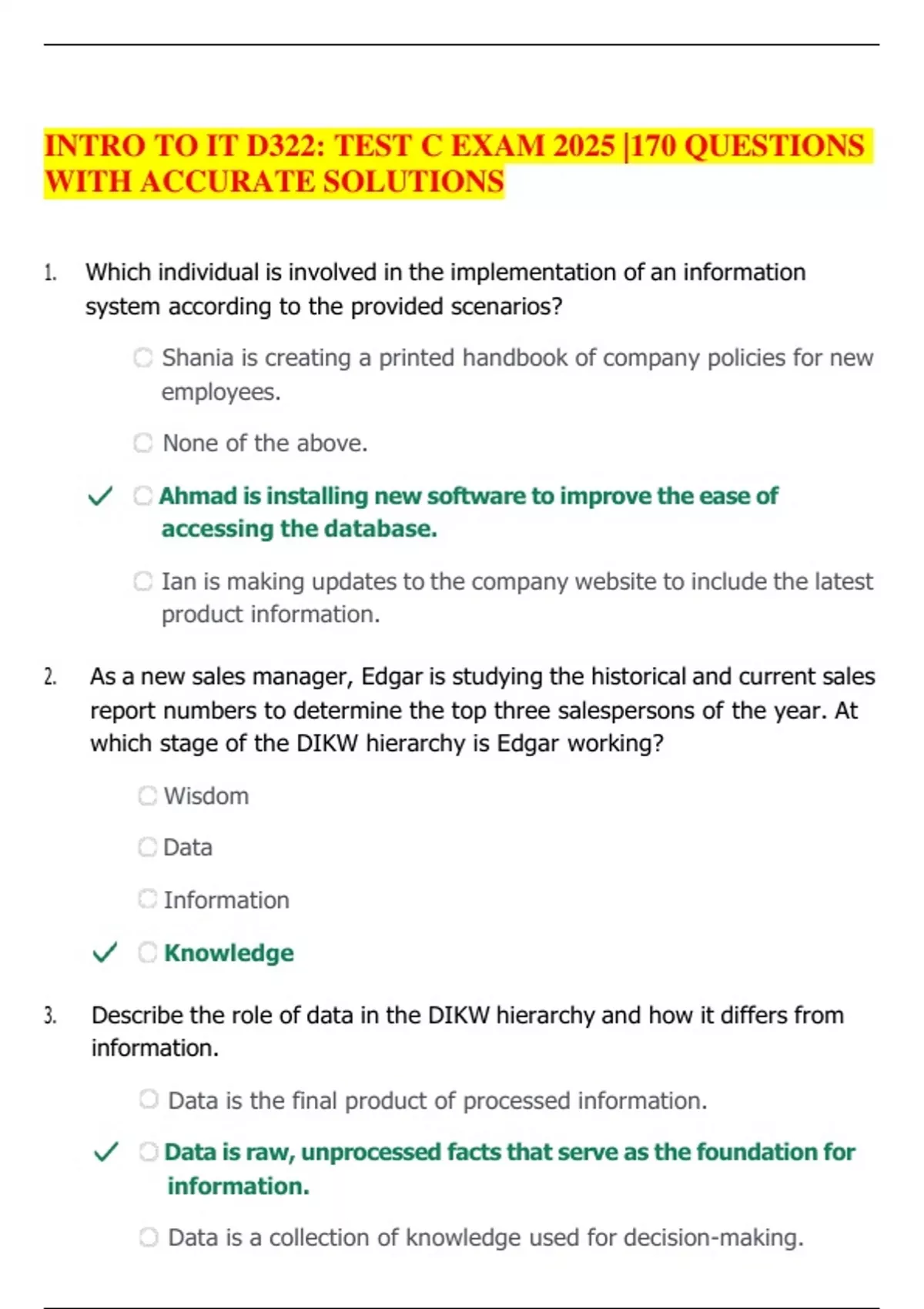 Which individual is involved in the implementation of an information system according to the provided scenarios? Shania is creating a printed handbook of company policies for new employees. None of the above. Ahmad is installing new software to improve the ease of accessing the database. Ian is making updates to the company website to include the latest product information. 2. As a new sales manager, Edgar is studying the historical and current sales report numbers to determine the top three salespersons of the year. At which stage of the DIKW hierarchy is Edgar working? Wisdom Data Information Knowledge 3. Describe the role of data in the DIKW hierarchy and how it differs from information. Data is the final product of processed information. Data is raw, unprocessed facts that serve as the foundation for information.