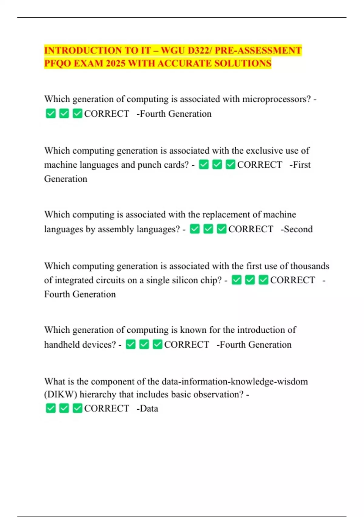 INTRODUCTION TO IT – WGU D322/ PRE-ASSESSMENT PFQO EXAM 2025 WITH ACCURATE SOLUTIONS