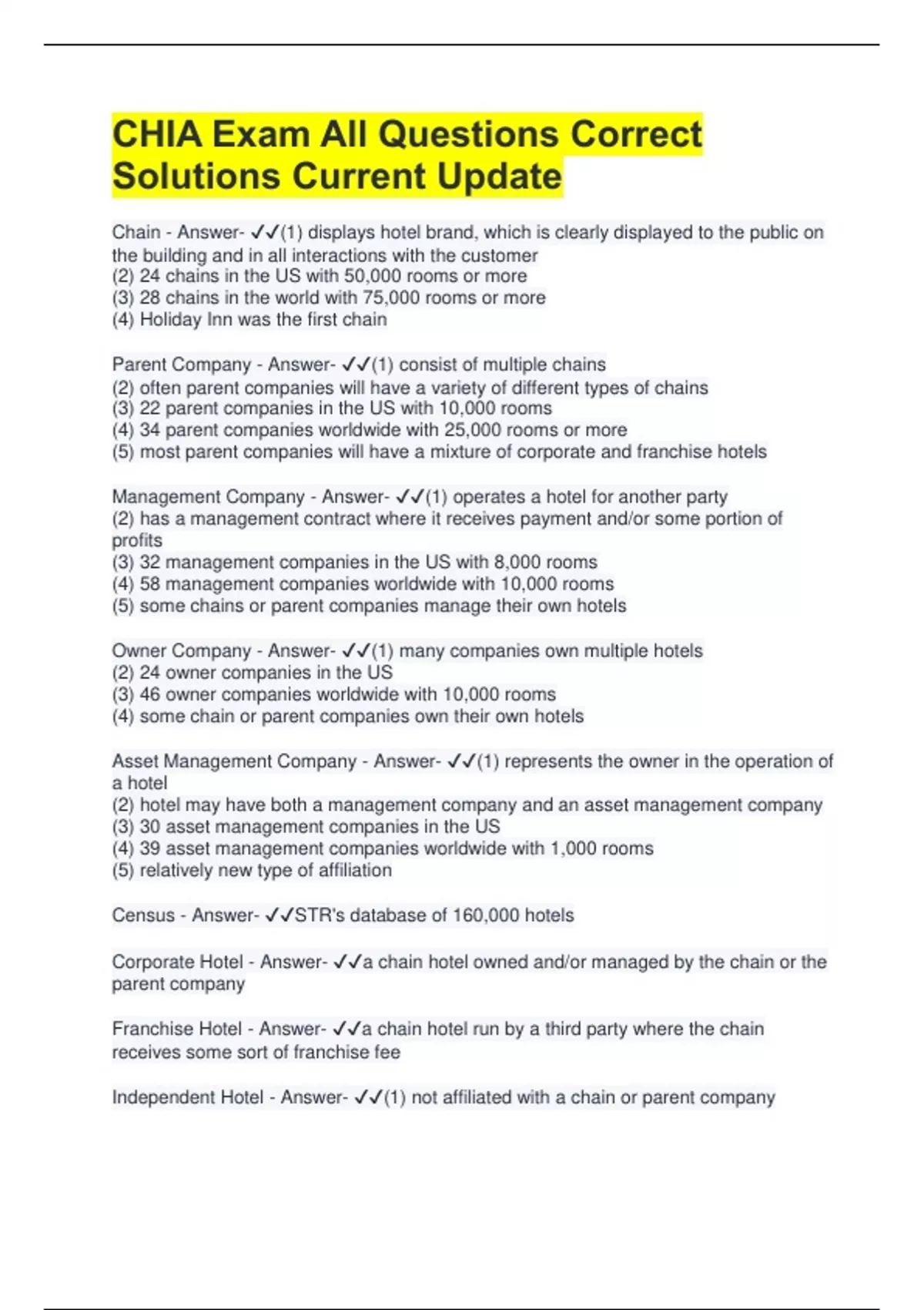 CHIA Exam All Questions Correct Solutions Current Update Chain - Answer- (1) displays hotel brand, which is clearly displayed to the public on the building and in all interactions with the customer (2) 24 chains in the US with 50,000 rooms or more (3) 28 chains in the world with 75,000 rooms or more (4) Holiday Inn was the first chain Parent Company - Answer- (1) consist of multiple chains (2) often parent companies will have a variety of different types of chains (3) 22 parent companies in the US with 10,000 rooms (4) 34 parent companies worldwide with 25,000 rooms or more (5) most parent companies will have a mixture of corporate and franchise hotels Management Company - Answer- (1) operates a hotel for another party (2) has a management contract where it receives payment and/or some portion of profits (3) 32 management companies in the US with 8,000 rooms (4) 58 management companies worldwide with 10,000 rooms (5) some chains or parent companies manage their own hotels Owner Company - Answer- (1) many companies own multiple hotels (2) 24 owner companies in the US (3) 46 owner companies worldwide with 10,000 rooms (4) some chain or parent companies own their own hotels Asset Management Company - Answer- (1) represents the owner in the operation of a hotel (2) hotel may have both a management company and an asset management company (3) 30 asset management companies in the US (4) 39 asset management companies worldwide with 1,000 rooms (5) relatively new type of affiliation Census - Answer- STR's database of 160,000 hotels Corporate Hotel - Answer- a chain hotel owned and/or managed by the chain or the parent company Franchise Hotel - Answer- a chain hotel run by a third party where the chain receives some sort of franchise fee Independent Hotel - Answer- (1) not affiliated with a chain or parent company (2) 21,300 independent hotels in the US with 1.5 million rooms (3) 100,000 independent hotels in the world in the STR database with 7.2 million rooms Chain to Independent hotel distribution - Answer- (1) in the US: 70% chain, 30% independent (2) worldwide: 47% chain, 53% independent How many hotels provide performance data to STR? - Answer- (1) in the US: 31,000 hotels, 94% of chain hotels and 2,200 independent hotels (2) outside US: 20,000 hotels, including 2,900 independent hotels Quasi Chains or Soft Brands - Answer- (1) cross between a chain and a marketing group from independent hotels (2) created to bring hotels under a parent company flag (3) hotels receive benefits of a parent company while being fairly independent (4) smaller franchise fees and more independence than a true chain or brand What are the 6 major geographic categories used by the hotel industry? - Answer- (1) world (2) continent (3) sub-continent (4) country (5) market (6) tract or submarket Continents and Subcontinents - Answer- (1) 4 continents: Americas, Europe, Mideast/Africa, and Asia Pacific (2) each continent has 3-4 subcontinents (3) STR definitions roughly correspond to the UNWTO definitions Americas subcontinents - Answer- (1) caribbean (2) central america (3) north america (4) south america Asia Pacific subcontinents - Answer- (1) central & south asia (2) northeastern asia (3) southeastern asia (4) australia & oceania Europe subcontinents - Answer- (1) eastern europe (2) northern europe (3) southern europe (4) western europe Mideast Africa - Answer- (1) middle east (2) northern africa (3) southern africa Countries - Answer- (1) STR uses UNWTO definitions when recognizing countries (2) Territories such as US virgin islands and puerto rico would appear as separate countries (3) there are 211 countries with one or more hotel (4) there 39 countries with 50,000 rooms or more (5) there are 9 countries with no properties (Central African Republic, Falkland Islands, Kiribati, Kosovo, Liberia, Nauru, North Korea, South Sudan, and Tuvalu) How many hotels are there in the US? - Answer- 53,000 Regions - Answer- (1) Larger countries are split into regions (2) there are 9 regions in the US that correspond to the government census regions Markets - Answer- (1) market is one of the most important geographic categories below country, especially for a hotel GM (2) Markets are created based upon the number of hotels in an area and the participation (3) Markets are commonly thought of as cities, although they are also used to represent more more rural areas outside of the major cities (4) in some countries, there may be large number of markets, whereas in others, especially developing areas, there may be just a small number of markets Markets in the US - Answer- (1) the US is broken up into 163 geographic areas called markets (2) Markets roughly correspond to governments MSAs (Metropolitan Statistical Areas) (3) sometimes markets cross state borders Groupings of US Markets - Answer- (1) there are 93 metro markets (cities) and 70 non-metro markets (rural areas) (2) markets are reviewed annually to determine if new markets may be created based on growth in available supply and sample (3) the metro markets are sometimes separated into major cities and secondary cities (4) in less populated states, the whole state may be a market Worldwide Markets - Answer- (1) countries outside the US contain varying numbers of markets. Markets are based upon the number of hotels and the participation (2) markets are reviewed annually to determine if new markets may be created based on growth in available supply and sample (3) smaller countries may consist of a single market (4) countries that are slightly larger may consist of a market for the major city and then a second market for all of the other hotels, named something like "Country Name Area