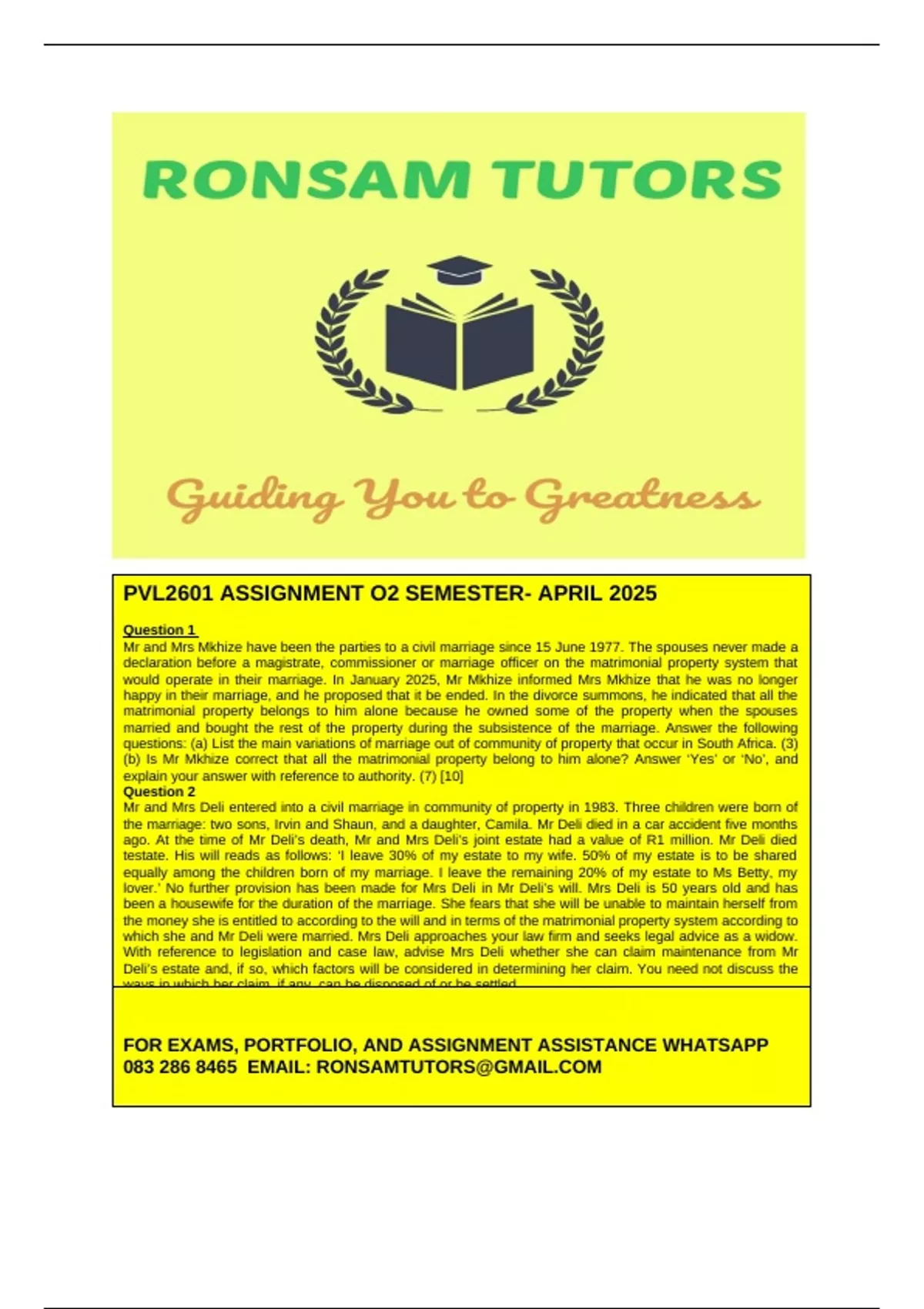 PVL2601– Assignment 02 Answers (April 2025)- For expert assistance with assignments and exam preparation, contact 0/8/3/2/8/6/8/4/6/5. Question 1 Mr and Mrs Mkhize have been the parties to a civil marriage since 15 June 1977. The spouses never made a declaration before a magistrate, commissioner or marriage officer on the matrimonial property system that would operate in their marriage. In January 2025, Mr Mkhize informed Mrs Mkhize that he was no longer happy in their marriage, and he proposed that it be ended. In the divorce summons, he indicated that all the matrimonial property belongs to him alone because he owned some of the property when the spouses married and bought the rest of the property during the subsistence of the marriage. Answer the following questions: (a) List the main variations of marriage out of community of property that occur in South Africa. (3) (b) Is Mr Mkhize correct that all the matrimonial property belong to him alone? Answer ‘Yes’ or ‘No’, and explain your answer with reference to authority. (7) [10] Question 2 Mr and Mrs Deli entered into a civil marriage in community of property in 1983. Three children were born of the marriage: two sons, Irvin and Shaun, and a daughter, Camila. Mr Deli died in a car accident five months ago. At the time of Mr Deli’s death, Mr and Mrs Deli’s joint estate had a value of R1 million. Mr Deli died testate. His will reads as follows: ‘I leave 30% of my estate to my wife. 50% of my estate is to be shared equally among the children born of my marriage. I leave the remaining 20% of my estate to Ms Betty, my lover.’ No further provision has been made for Mrs Deli in Mr Deli’s will. Mrs Deli is 50 years old and has been a housewife for the duration of the marriage. She fears that she will be unable to maintain herself from the money she is entitled to according to the will and in terms of the matrimonial property system according to which she and Mr Deli were married. Mrs Deli approaches your law firm and seeks legal advice as a widow. With reference to legislation and case law, advise Mrs Deli whether she can claim maintenance from Mr Deli’s estate and, if so, which factors will be considered in determining her claim. You need not discuss the ways in which her claim, if any, can be disposed of or be settled.