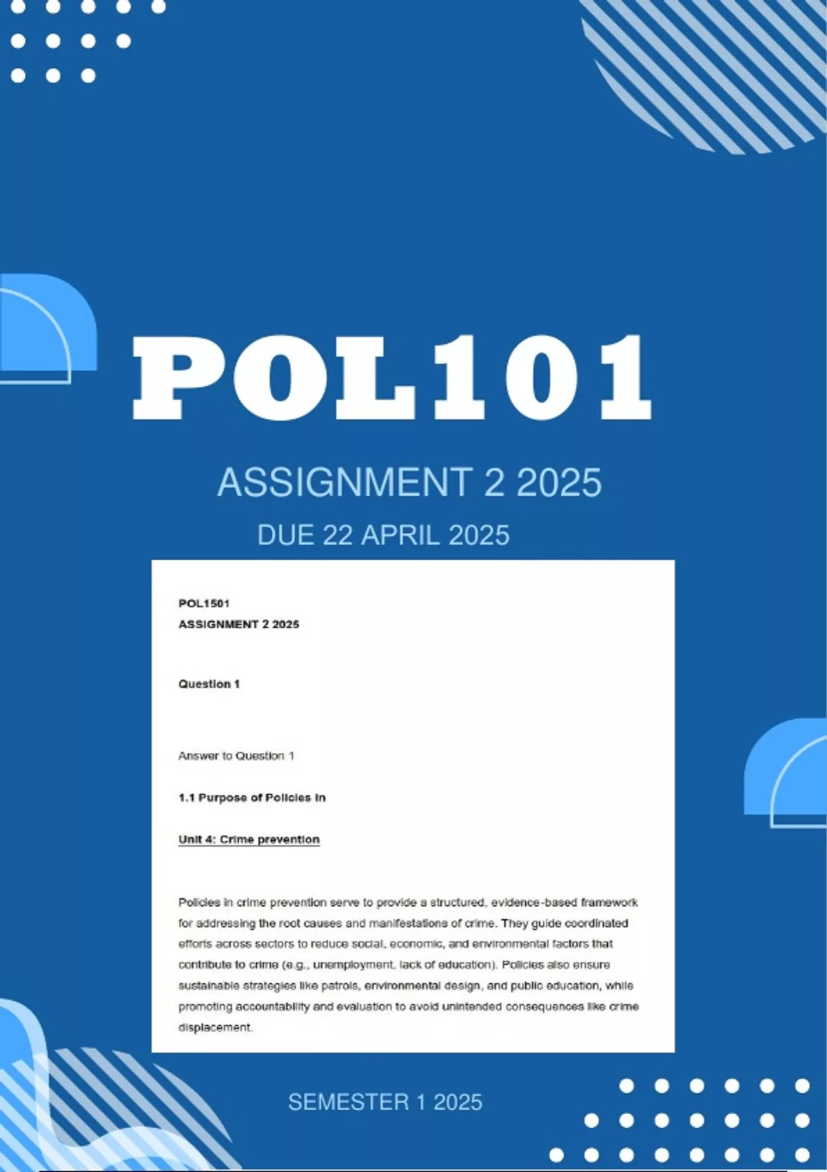 POL1501 ASSIGNMENT 2 2025 Question 1 Answer to Question 1 1.1 Purpose of Policies in Unit 4: Crime prevention Policies in crime prevention serve to provide a structured, evidence-based framework for addressing the root causes and manifestations of crime. They guide coordinated efforts across sectors to reduce social, economic, and environmental factors that contribute to crime (e.g., unemployment, lack of education). Policies also ensure sustainable strategies like patrols, environmental design, and public education, while