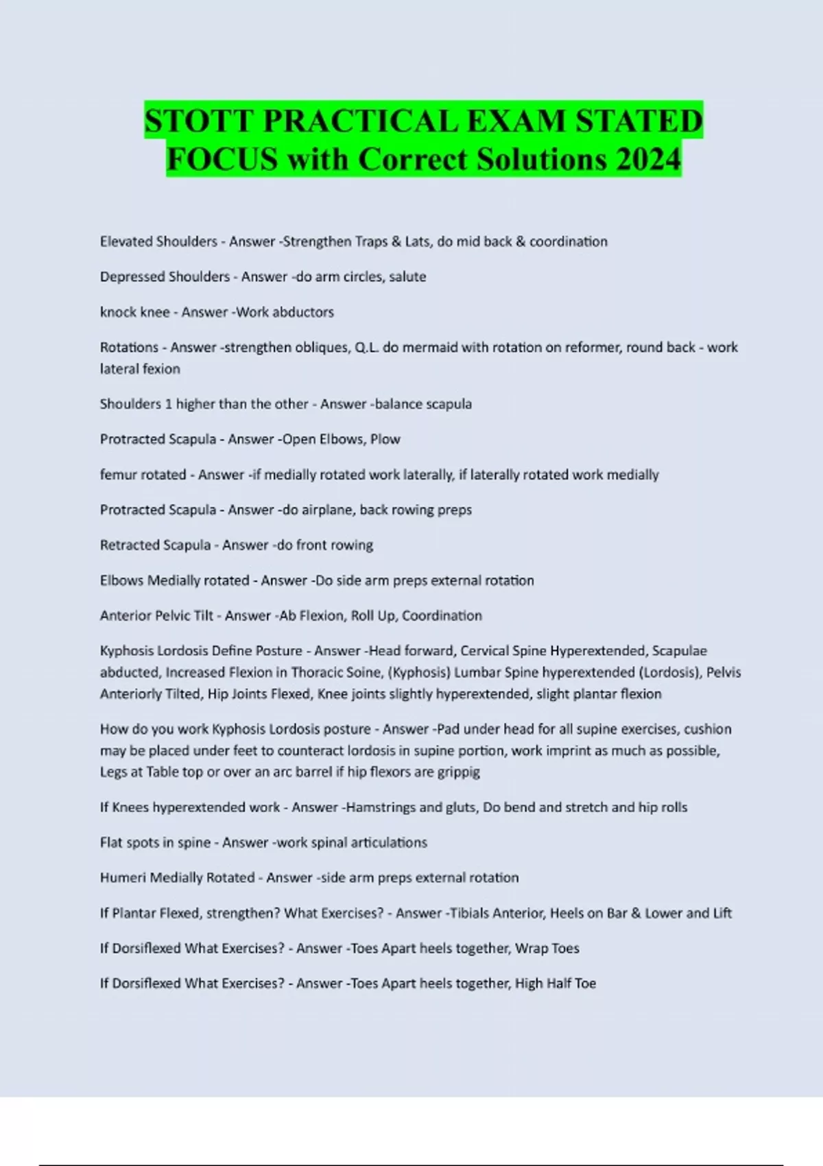 STOTT PRACTICAL EXAM STATED FOCUS with Correct Solutions 2024 Elevated Shoulders - Answer -Strengthen Traps & Lats, do mid back & coordination Depressed Shoulders - Answer -do arm circles, salute knock knee - Answer -Work abductors Rotations - Answer -strengthen obliques, Q.L. do mermaid with rotation on reformer, round back - work lateral fexion Shoulders 1 higher than the other - Answer -balance scapula Protracted Scapula - Answer -Open Elbows, Plow femur rotated - Answer -if medially rotated work laterally, if laterally rotated work medially Protracted Scapula - Answer -do airplane, back rowing preps Retracted Scapula - Answer -do front rowing Elbows Medially rotated - Answer -Do side arm preps external rotation Anterior Pelvic Tilt - Answer -Ab Flexion, Roll Up, Coordination Kyphosis Lordosis Define Posture - Answer