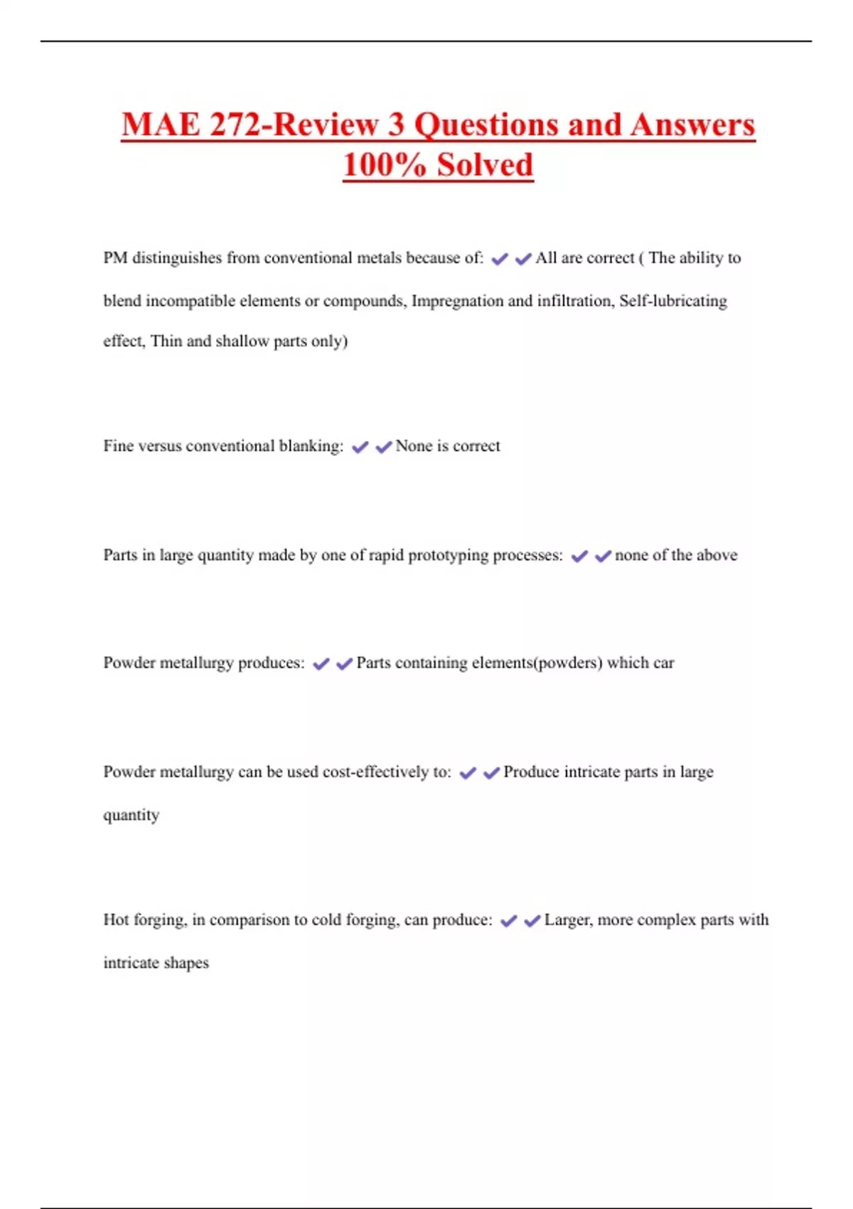MAE 272-Review 3 Questions and Answers 100% Solved PM distinguishes from conventional metals because of: All are correct ( The ability to blend incompatible elements or compounds, Impregnation and infiltration, Self-lubricating effect, Thin and shallow parts only) Fine versus conventional blanking: None is correct Parts in large quantity made by one of rapid prototyping processes: none of the above