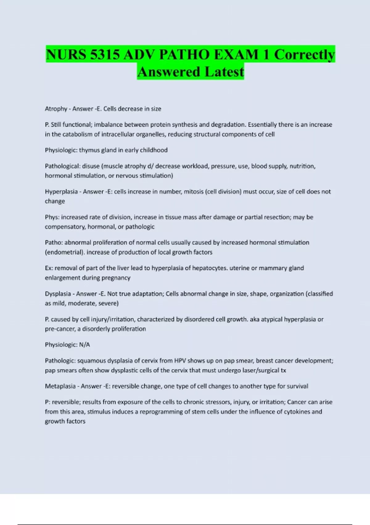 NURS 5315 ADV PATHO EXAM 1 Correctly Answered Latest Atrophy - Answer -E. Cells decrease in size P. Still functional; imbalance between protein synthesis and degradation. Essentially there is an increase in the catabolism of intracellular organelles, reducing structural components of cell Physiologic: thymus gland in early childhood Pathological: disuse (muscle atrophy d/ decrease workload, pressure, use, blood supply, nutrition, hormonal stimulation, or nervous stimulation) Hyperplasia - Answer -E: cells increase in number, mitosis (cell division) must occur, size of cell does not change Phys: increased rate of division, increase in tissue mass after damage or partial resection; may be compensatory, hormonal, or pathologic Patho: abnormal proliferation of normal cells usually caused by increased hormonal stimulation (endometrial). increase of production of local growth factors Ex: removal of part of the liver lead to hyperplasia of hepatocytes. uterine or mammary gland enlargement during pregnancy Dysplasia - Answer -E. Not true adaptation; Cells abnormal change in size, shape, organization (classified as mild, moderate, severe) P. caused by cell injury/irritation, characterized by disordered cell growth. aka atypical hyperplasia or pre-cancer, a disorderly proliferation Physiologic: N/A Pathologic: squamous dysplasia of cervix from HPV shows up on pap smear, breast cancer development; pap smears often show dysplastic cells of the cervix that must undergo laser/surgical tx Metaplasia - Answer -E: reversible change, one type of cell changes to another type for survival P: reversible; results from exposure of the cells to chronic stressors, injury, or irritation; Cancer can arise from this area, stimulus induces a reprogramming of stem cells under the influence of cytokines and growth factorsEx: Patho: Columnar cells change to squamous cells in lungs of smoker or normal ciliated epithelial cells of the bronchial linings are replaced by stratified squamous epithelial cells.; Phys: Barrett Esophagusnormal squamous cells change to columnar epithelial cells in response to reflux, aka intestinal metaplasia Hypoxia injury - Answer -E. inadequate oxygenation of tissues P. decrease in mitochondrial function, decreased production of ATP increases anaerobic metabolism. eventual cell death. C.M. hypoxia, cyanosis, cognitive impairment, lethargy Free radical and ROS - Answer -E. normal byproduct of ATP production, will overwhelm the mitochondria- exhaust intracellular antioxidants P. lipid peroxidation, damage proteins, fragment DNA C.M. development in Alzheimer's, heart disease, Parkinson's disease, Amyotrophic Lateral Sclerosis Ethanol - Answer -E. mood altering drug, long term effects on liver and nutritional status P. metabolized by liver, generates free radicals C.M. CNS depression, nutrient deficiencies-Mag, Vit B6, thiamine, PO4, inflammation and fatty infiltration of liver, hepatomegaly, leads to liver failure irreversible Oncosis - Answer -Na and H2O enter cell and cause swelling. Organ increases in weight, becomes distended and pale. Associated with high fever, hypocalcemia, certain infections Fatty Infiltration - Answer -intracellular accumulation of lipids in the liver liver fails to metabolize lipids. usually from ETOH or high fat diet. can lead to cirrhosis dystrophic calcification - Answer -accumulation of Ca in dead or dying tissues calcium salt clump and harden- interfere with cellular structure and function r/t pulmonary TB, atherosclerosis, injured heart valves, chronic pancreatitis metastatic calcification - Answer -accumulation of Ca in normal tissue result of hypercalcemia r/t hyperparathyroidism, hyperthyroidism, toxic levels of Vit D. Can also r/t hyperphosphatemia in renal failure urate accumulation - Answer -sodium urate crystals are deposited in tissues- group of disorders collectively called gout- acute arthritis, chronic gouty arthritis, tophus, nephritis Coagulative Necrosis - Answer -kidneys, heart, adrenals- secondary to hypoxiaLiquefactive Necrosis - Answer -nerve cells- brain- accumulation of pus Caseous Necrosis - Answer -lung disease- usually TB- tissue looks like clumped cheese Fat Necrosis - Answer -breast, pancreas, abdominal structures- creates soaps Gangrenous Necrosis - Answer -Dry- dark shriveled skin Wet- internal organs- can lead to death Gas- from clostridium- antitoxins and hyperbaric therapy Gout - Answer -E. disturbances in serum urate levels. uncommon for < 30 years old. P. uric acid is deposited in the tissues of kidney, h