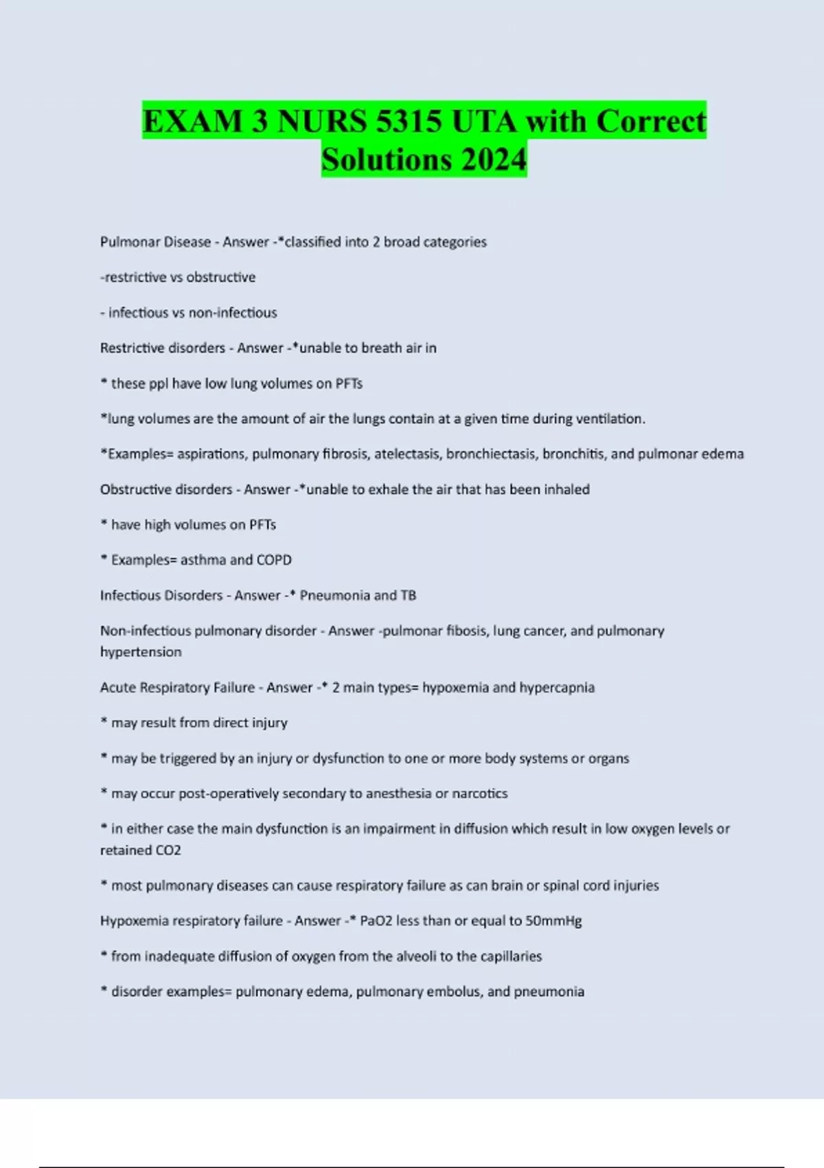 EXAM 3 NURS 5315 UTA with Correct Solutions 2024 Pulmonar Disease - Answer -*classified into 2 broad categories -restrictive vs obstructive - infectious vs non-infectious Restrictive disorders - Answer -*unable to breath air in * these ppl have low lung volumes on PFTs *lung volumes are the amount of air the lungs contain at a given time during ventilation. *Examples= aspirations, pulmonary fibrosis, atelectasis, bronchiectasis, bronchitis, and pulmonar edema Obstructive disorders - Answer -*unable to exhale the air that has been inhaled * have high volumes on PFTs * Examples= asthma and COPD Infectious Disorders - Answer -* Pneumonia and TB Non-infectious pulmonary disorder - Answer -pulmonar fibosis, lung cancer, and pulmonary hypertension Acute Respiratory Failure - Answer -* 2 main types= hypoxemia and hypercapnia * may result from direct injury * may be triggered by an injury or dysfunction to one or more body systems or organs * may occur post-operatively secondary to anesthesia or narcotics * in either case the main dysfunction is an impairment in diffusion which result in low oxygen levels or retained CO2 * most pulmonary diseases can cause respiratory failure as can brain or spinal cord injuries Hypoxemia respiratory failure - Answer -* PaO2 less than or equal to 50mmHg * from inadequate diffusion of oxygen from the alveoli to the capillaries * disorder examples= pulmonary edema, pulmonary embolus, and pneumoniaHypercapnic respiratory failure - Answer -* PaCO2 greater than or equal to 50mmHg * from inadequate alveolar ventilation * cause= depression of respiratory function from meds, abnormal spinal cord, disorders of the medulla, disease of neuromuscular junction, chest wall injury, COPD, and obstruction or large airways. Pneumothorax - Answer -* presence of air or gas in the pleural space * air may press against the lungs and cause the lung to collapse * 2 main types= spontaneous and secondary * clinical manifestations= sudden pleural pain, tachypnea, dyspnea, decreased breath sounds, and HYPPEROSANCE TO PERCUSSION Spontaneous pneumothorax - Answer -* occurs in males 20-40 years of age that are tall and thin * may occur in bleb ruptures in ppl with emphysema * smoking increases the risk * bleb ruptures may be at rest or exercise and in the apexes * may be a genetic component or family history Secondary pneumothorax - Answer -* caused by trauma * tension pneumothorax occurs when air becomes trapped and can't escape * site of injury acts as a one way valve only letting air in * pt may experiene a complete lung collapse * signs are a deviated trachea, shortness of breath, and hypotension Pulmonary Edema - Answer -* accumulation of water in the pulmonary alveolar sacs * prevents proper exchange of gas * leads to dyspnea, chest pain, and hypoxia * may have orthopnea or paroxymal nocturnal dyspnea * pulmonary edema is most commonly caused by left sided heart failure * LSHF the blood backs up into the lungs and increases the capillary hydrostatic pressure, this pushes fluid into the alveolar sacs