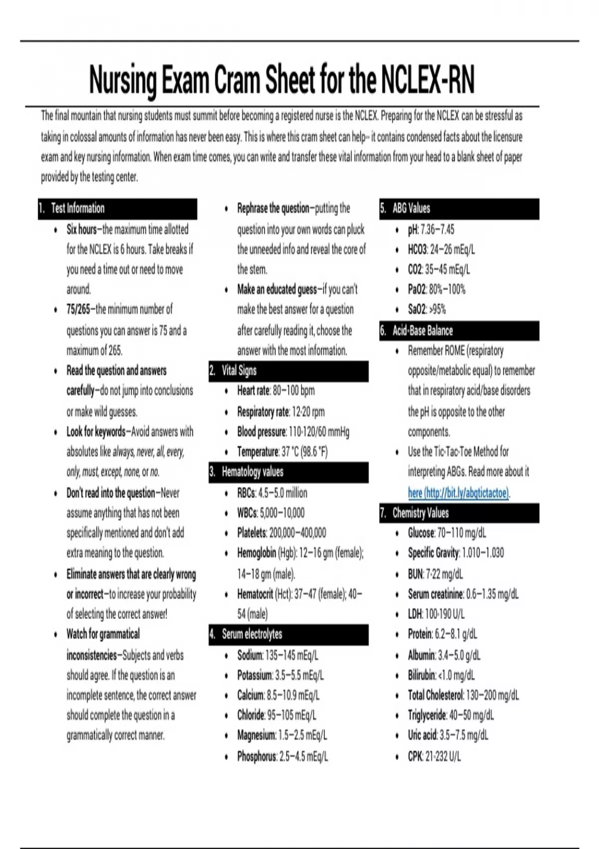 Nursing Exam Cram Sheet for the NCLEX-RN