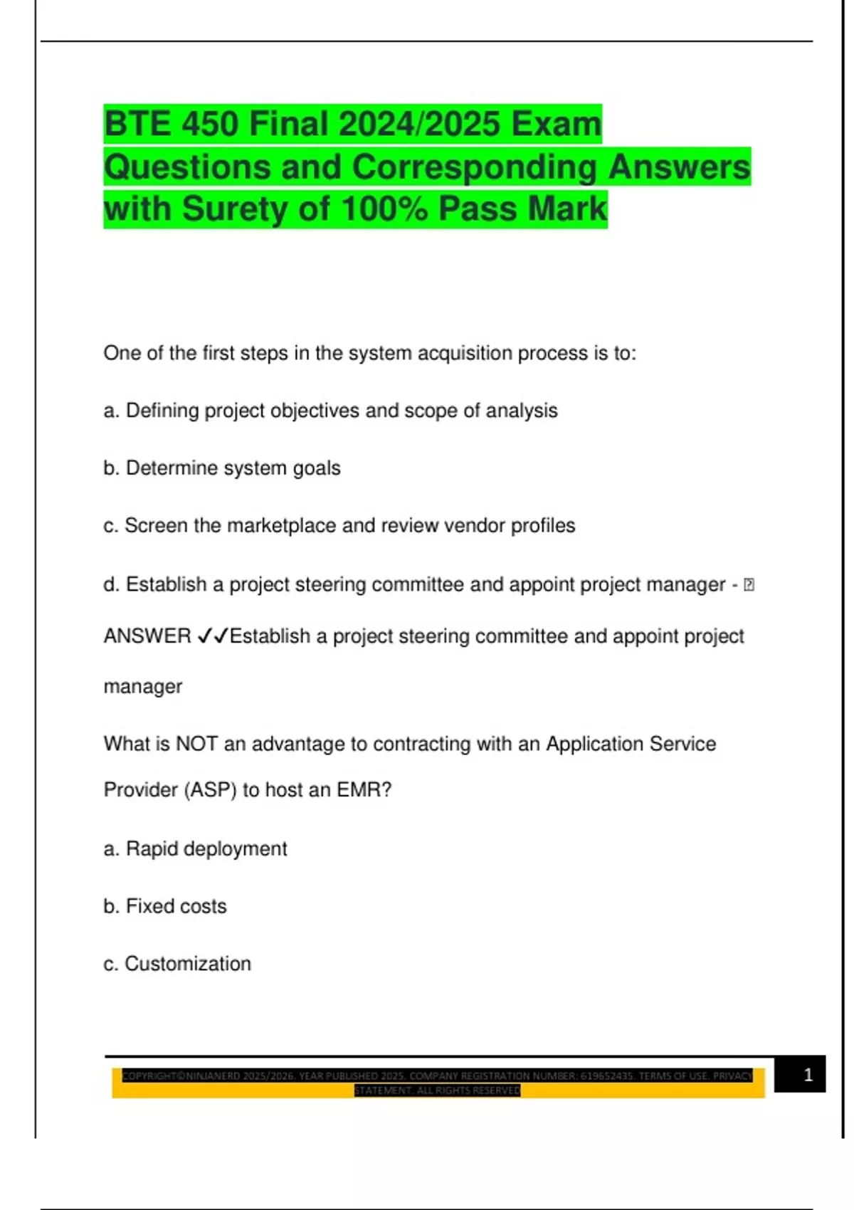 BTE 450 Final 2024/2025 Exam Questions and Corresponding Answers with Surety of 100% Pass Mark One of the first steps in the system acquisition process is to: a. Defining project objectives and scope of analysis b. Determine system goals c. Screen the marketplace and review vendor profiles d. Establish a project steering committee and appoint project manager -