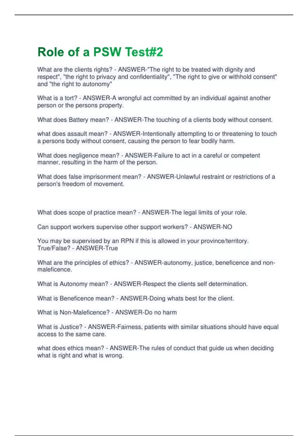 What are the clients rights? - ANSWER-"The right to be treated with dignity and respect", "the right to privacy and confidentiality", "The right to give or withhold consent" and "the right to autonomy" What is a tort? - ANSWER-A wrongful act committed by an individual against another person or the persons property. What does Battery mean? - ANSWER-The touching of a clients body without consent. what does assault mean? - ANSWER-Intentionally attempting to or threatening to touch a persons body without consent, causing the person to fear bodily harm. What does negligence mean? - ANSWER-Failure to act in a careful or competent manner, resulting in the harm of the person.