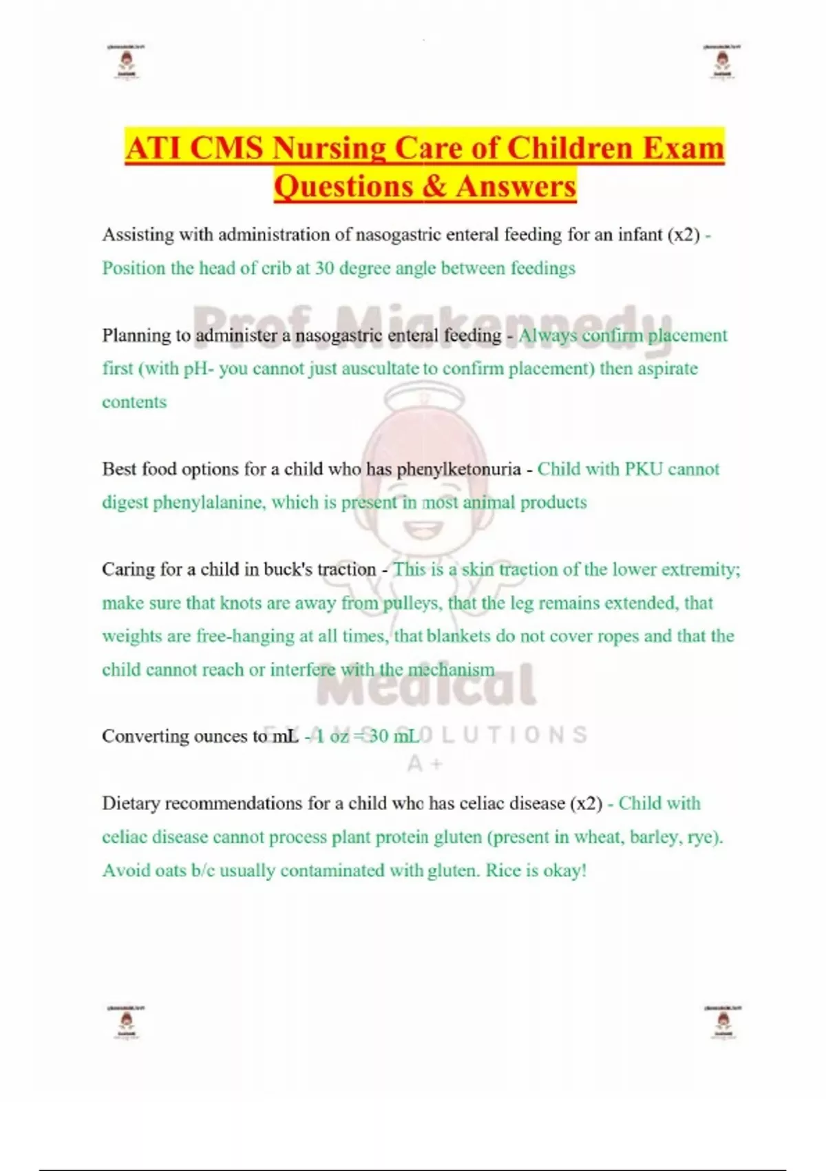 ATI CMS Nursing Care of Children Exam Questions & Answers-Assisting with administration of nasogastric enteral feeding for an infant (x2) - Position the head of crib at 30 degree angle between feedings Planning to administer a nasogastric enteral feeding - Always confirm placement first (with pH- you cannot just auscultate to confirm placement) then aspirate contents Best food options for a child who has phenylketonuria - Child with PKU cannot digest phenylalanine, which is present in most animal products Caring for a child in buck's traction - This is a skin traction of the lower extremity; make sure that knots are away from pulleys, that the leg remains extended, that weights are free-hanging at all times, that blankets do not cover ropes and that the child cannot reach or interfere with the mechanism Converting ounces to mL - 1 oz = 30 mL Dietary recommendations for a child who has celiac disease (x2) - Child with celiac disease cannot process plant protein gluten (present in wheat, barley, rye). Avoid oats b/c usually contaminated with gluten. Rice is okay! Dietary recommendations for child with lactose intolerance - Child needs supplementary calcium and vitamin D intake, as the dairy products that they cannot consume are high in calcium. Also, take lactase when consuming a dairy product.